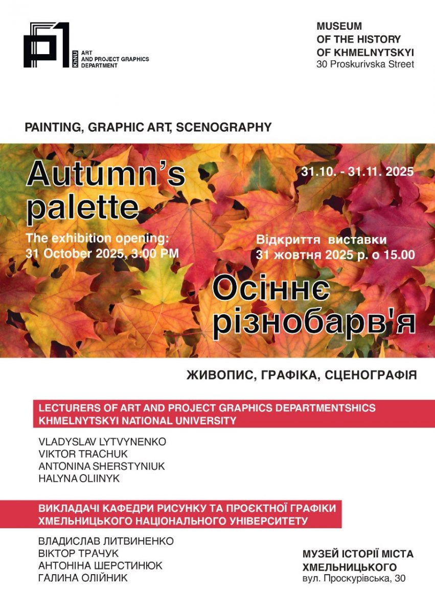 Нарешті втілюється в життя давно запланована мрія-подія: 31 жовтня 2025 року відкриваємо в мистецькій залі музею, на Проскурівській, 30, о 15.00, колективну виставку живопису, графіки, сценографії викладачів кафедри рисунку та проєктної графіки Хмельницького національного університету під назвою «Осіннє різнобарв`я».