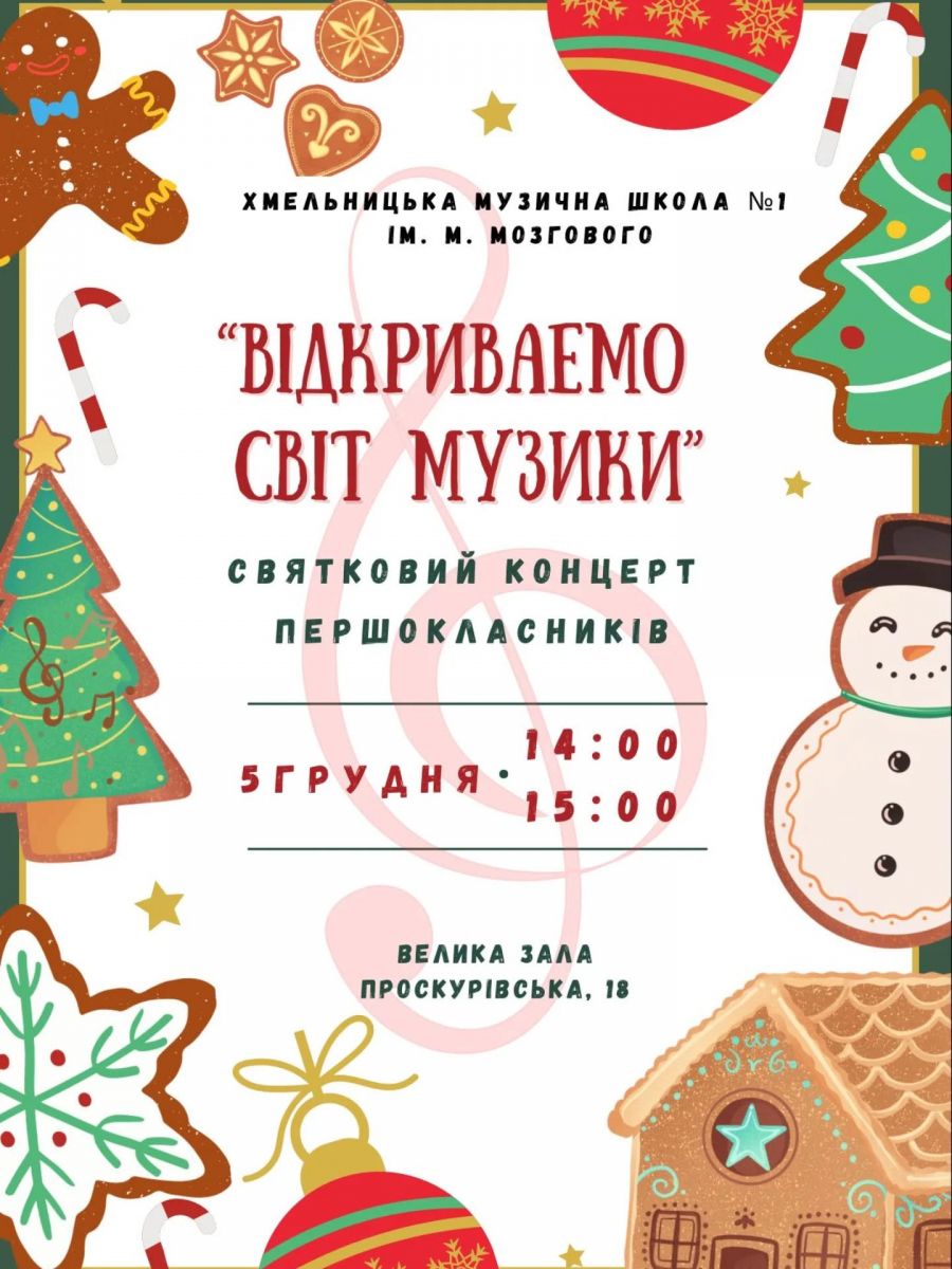 Тож запрошуємо вас, шановні глядачі, слухачі та поціновувачі мистецтва на концерти наших першокласників, які відбудуться 05 грудня о 14.00 та 15.00 годинах у великій залі Хмельницької музичної школи N°1 ім.М.Мозгового, за адресою вул.Проскурівська, 18.