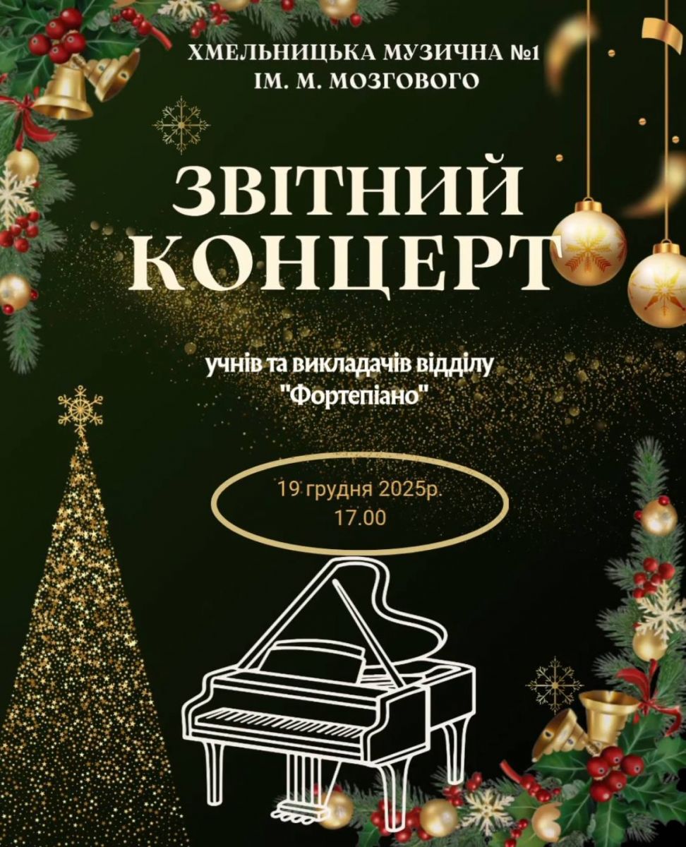 Запрошуємо на звітний концерт учнів та викладачів відділу "Фортепіано". Чекаємо на вас 19 грудня о 17.00 у великій залі Хмельницької музичної школи Nº1 ім.М. Мозгового за адресою вул. Проскурівська, 18.