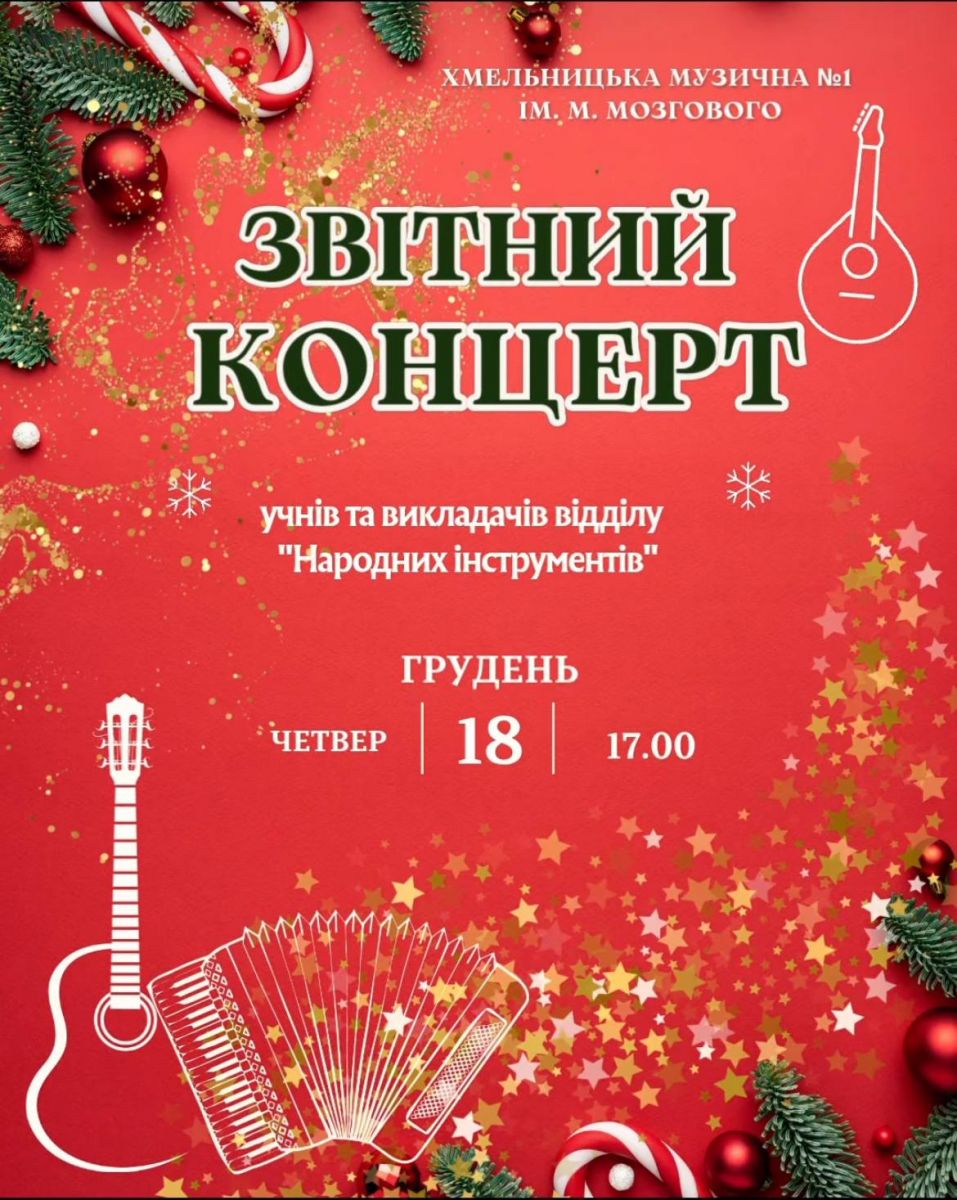 Чекаємо на вас 18 грудня о 17.00 у великій залі Хмельницької музичної школи Nº1 ім.М.Мозгового за адресою вул. Проскурівська, 18.