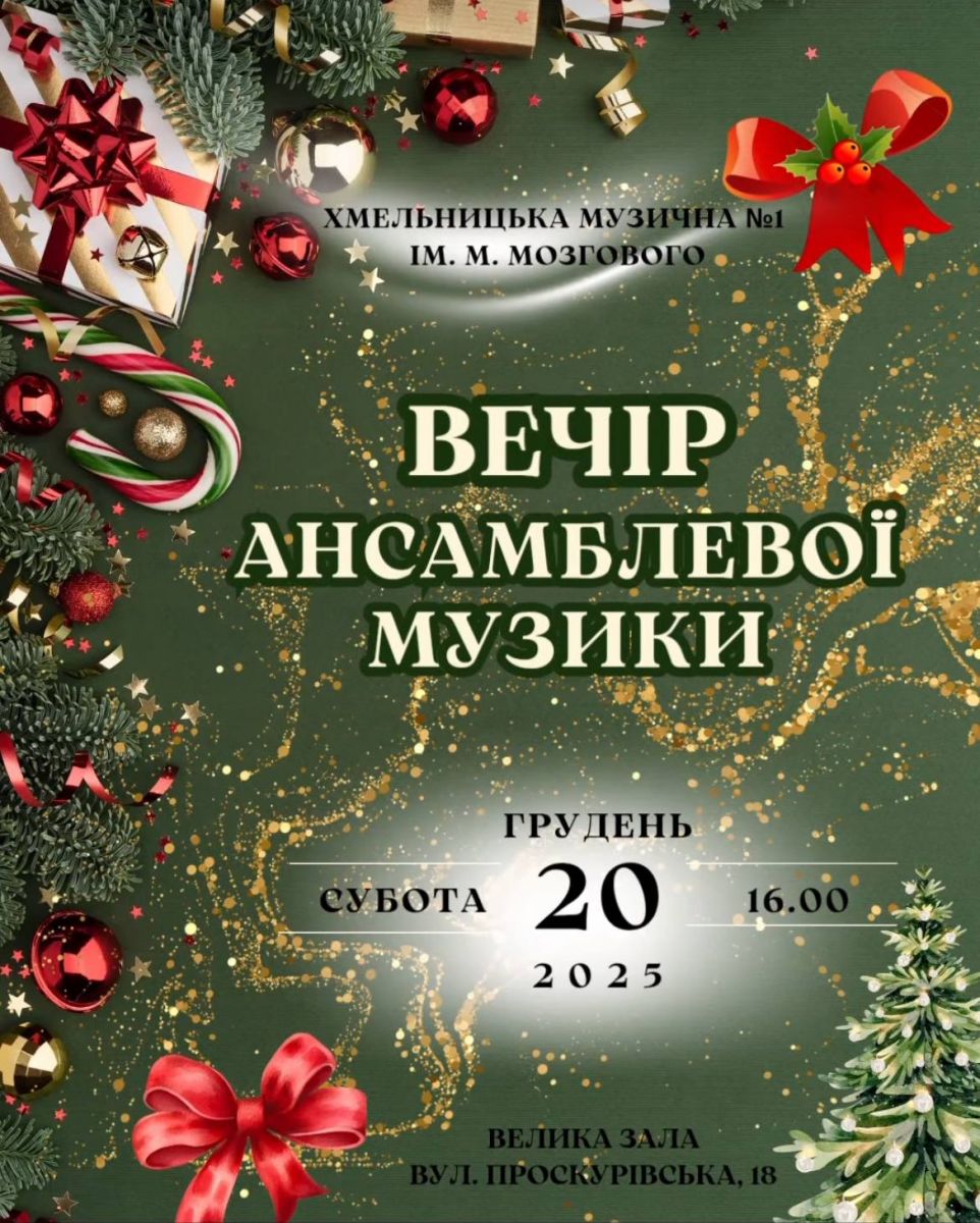 Запрошуємо на Вечір ансамблевої музики учнів та викладачів Хмельницької музичної школи N°1 ім. М. Мозгового. Цей концерт є яскравою демонстрацією творчих досягнень учнів та професійної майстерності викладачів нашої школи. На сцені виступлять усі колективи, що становлять гордість нашої школи. На вас чекають виступи оркестрів, ансамблів вокальних та інструментальних, хорових колективів, а також буде сюрприз для усіх глядачів, адже в концерті братимуть участь учні танцювальної школи "Pinna balet". Чекаємо на вас 20 грудня о 16.00 у великій залі Хмельницької музичної школи N°1 ім.М.Мозгового за адресою вул. Проскурівська, 18.