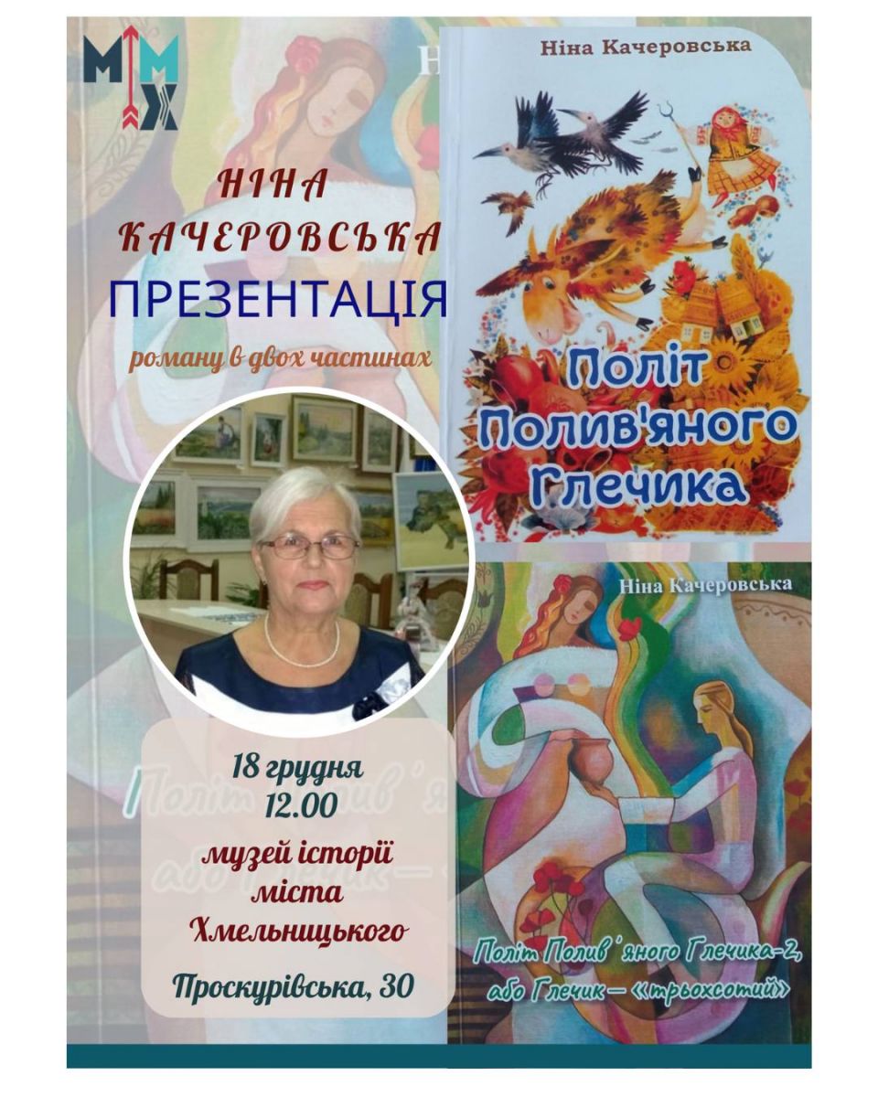Запрошуємо на презентацію роману у двох частинах "Політ Полив'яного Глечика" відомої подільської письменниці, поетеси, журналістки Ніни Качеровської, яка відбудеться 18 грудня 2025 року, о 12:00, в мистецькій залі музею історії міста Хмельницького, що на Проскурівський, 30.