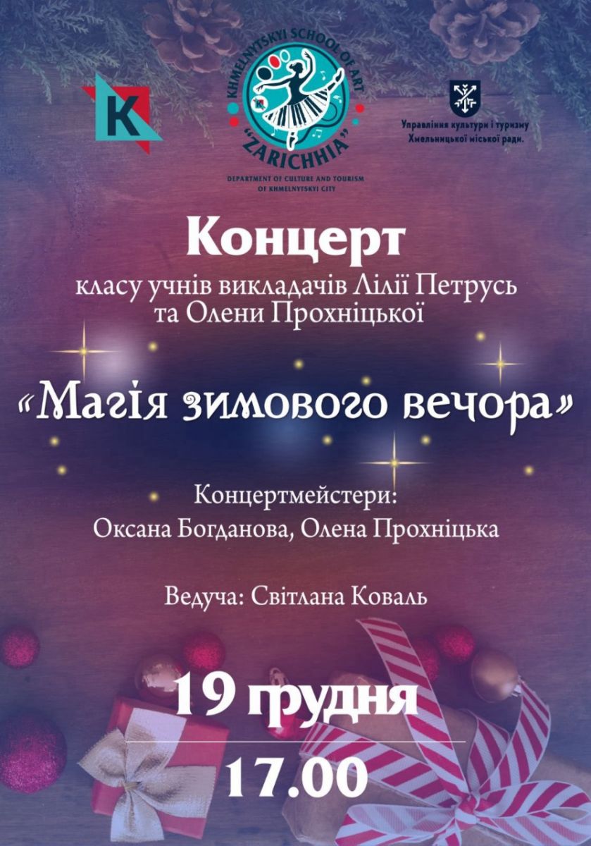 19.12 о 17:00 щиро запрошуємо на концерт учнів викладачів Лілії Петрусь та Олени Прохніцької під назвою " Магія зимового вечора "!