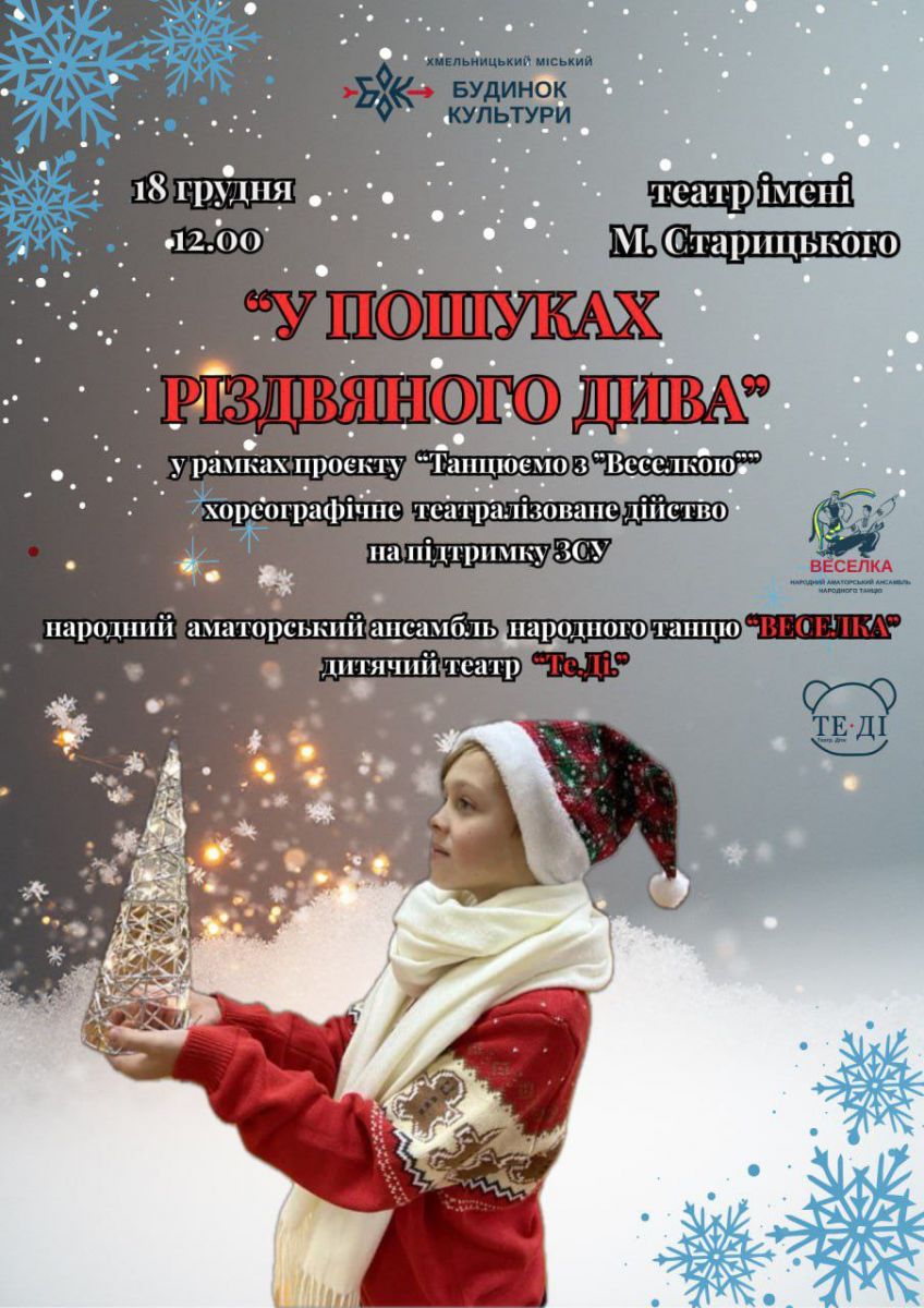 Народний ансамбль танцю "Веселка " у рамках проєкту "Танцюємо з Веселкою " проводить 18 грудня благодійне хореографічно- театралізоване дійство "У пошуках Різдвяного дива".