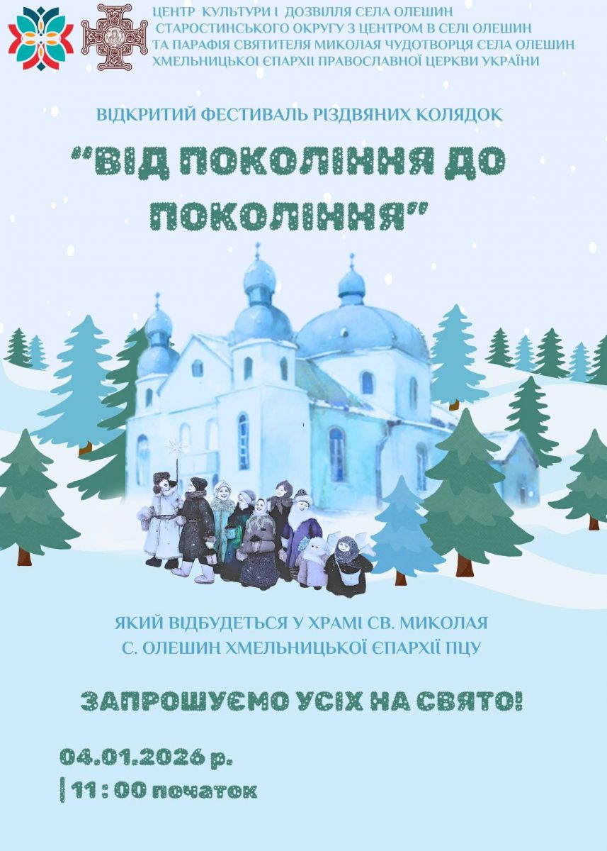 Запрошуємо на відкритий фестиваль різдвяних колядок "ВІД ПОКОЛІННЯ ДО ПОКОЛІННЯ" який відбудеться у храмі СВ. МИКОЛАЯ с. Олешин Хмельницької єпархії ПЦУ початок 04.01.2026 p. об 11:00