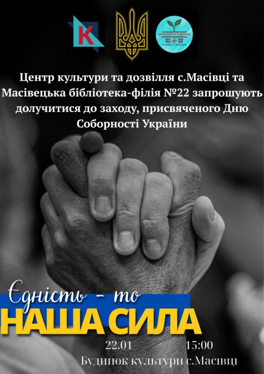 Центр культури та дозвілля с.Масівці та Масівецька бібліотека-філія Nº22 запрошують долучитися до заходу, присвяченого Дню Соборності України. Єдність - то НАША СИЛА 22.01 о 15:00. Будинок культури с.Масівці