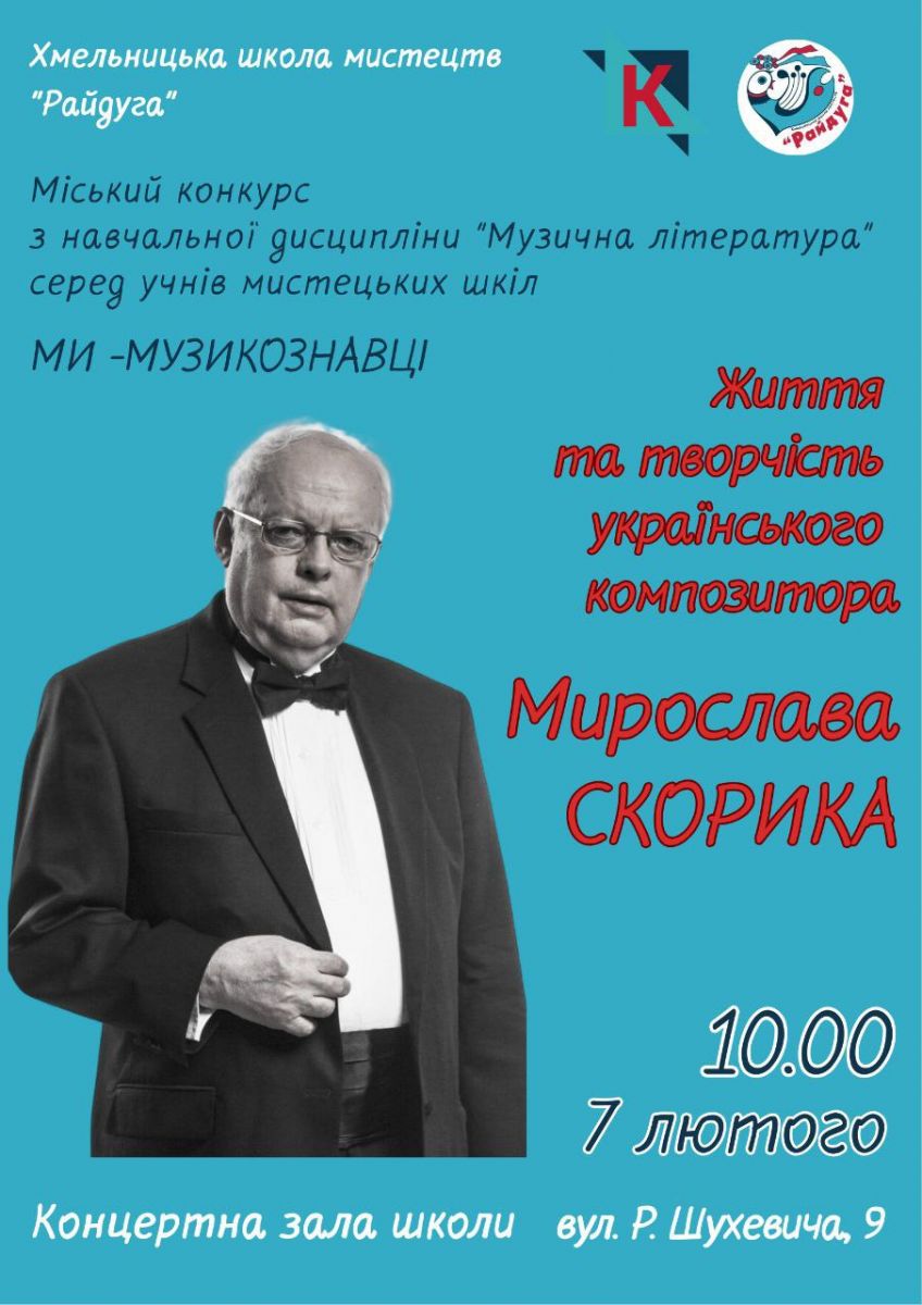 7 лютого у Хмельницькій школі мистецтв «Райдуга» втретє відбудеться міський конкурс з навчальної дисципліни «Музична література» серед учнів мистецьких шкіл «Ми — музикознавці». Метою конкурсу є поглиблення знань учнів з музичної літератури, розвиток аналітичного мислення, зацікавлення історією музичного мистецтва та популяризація української музичної культури. Цьогоріч конкурс присвячений життю та творчості видатного українського композитора Мирослава Скорика – митця, чия творчість поєднує національні традиції та сучасні художні пошуки й має вагоме значення для формування музичної культури молодого покоління. У конкурсі візьмуть участь учні мистецьких шкіл міста. Захід сприятиме підвищенню рівня музично-теоретичної підготовки та творчого розвитку юних музикознавців. Відкриття конкурсу відбудеться 7 лютого о 10.00 в приміщенні Хмельницької школи мистецтв «Райдуга» за адресою: вул. Романа Шухевича, 9.