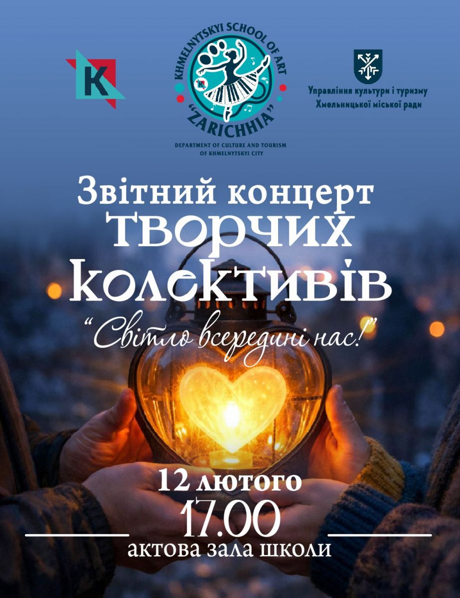 12 лютого о 17.00 у актовій залі Хмельницької школи мистецтв "Заріччя" відбудеться звітний концерт творчих колективів під назвою "Світло всередині нас ". Щиро запрошуємо!