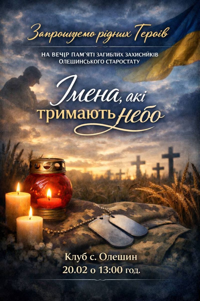 Запрошуємо рідних Героів НА ВЕЧІР ПАМ?ЯТІ ЗАГИБЛИХ ЗАХИСНИКІВ ОЛЕШИНСЬКОГО СТАРОСТАТУ "Імена, які тримають небо". Клуб с. Олешин 20.02 о 13:00 год.