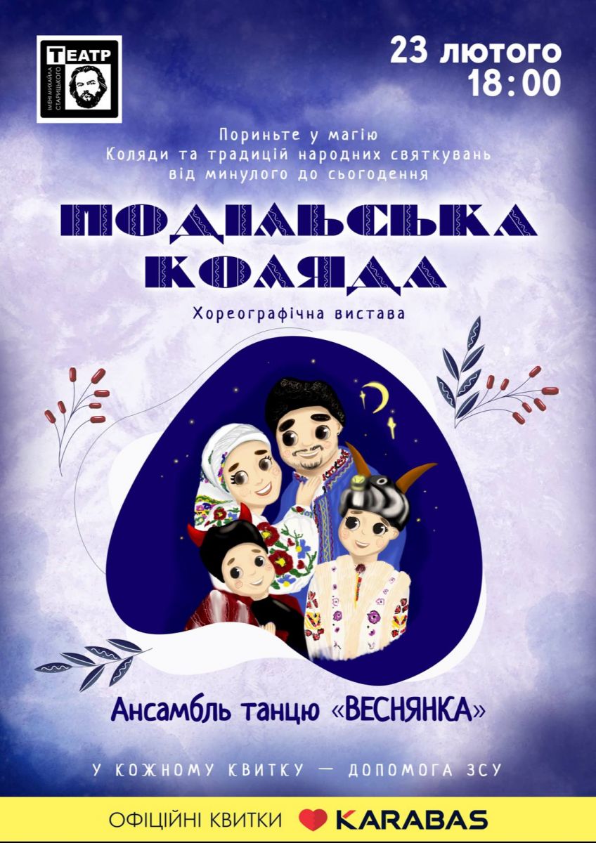Хореографічна вистава "Подільська Коляда" - розповідає мовою танцю про народні святкування зимового циклу свят на Поділлі від минулого до сьогодення . Це , і дівочі ворожіння на Андрія , і дитячі та юнацькі зимові забави , щедрування і кутя , і чортенята , що викрадають мішок з дарунками у колядників , і вечорниці на Василя , і запальні гуляння. Зиму проводжатимемо , Весну закликатимемо ! Артисти вистави - це діти , молодь і дорослі , учасники народного художнього колективу ансамблю танцю "Веснянка" , народного молодіжного ансамблю танцю "Веснянка" , ансамблю танцю " Берегиня" . Гості - фольклорний гурт «Ясниця» . Керівник - Олена Балан .