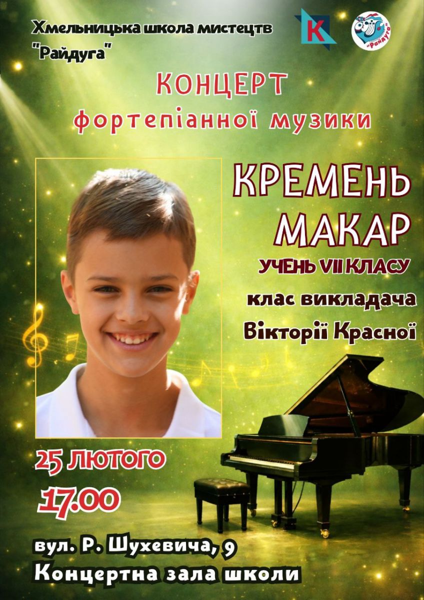 Концерт відбудеться 25 лютого 2026 р. о 17.00 год. у концертній залі Хмельницької школи мистецтв «Райдуга».