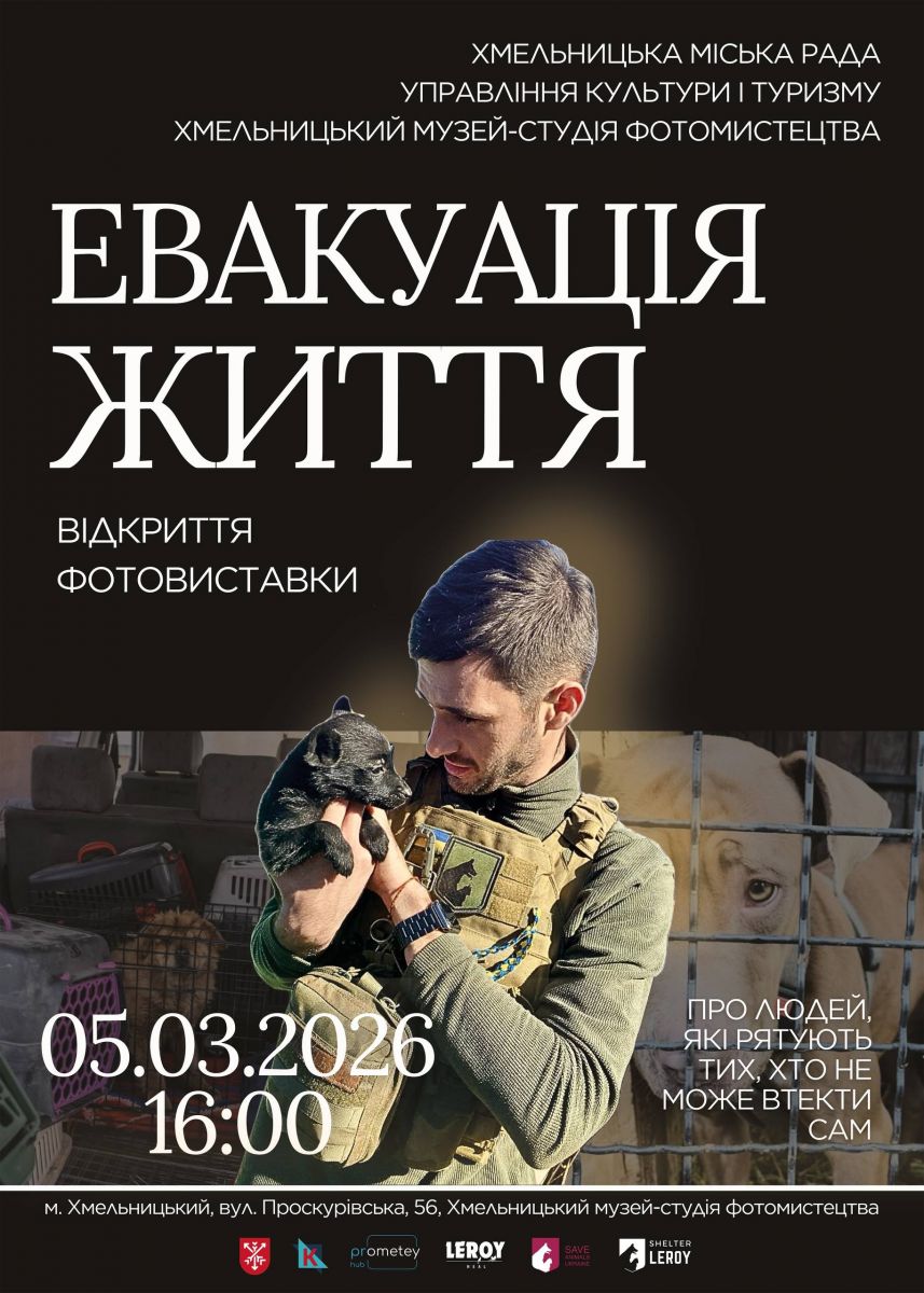 ГО "Захист тварин України" презентує виставку фотографій "Евакуація життя", яка присвячена порятунку тварин із прифронтових територій після повномасштабного вторгнення. Відкриття виставки відбудеться 5 березня 2026 р. о 16:00 в Хмельницькому музеї-студії фотомистецтва.