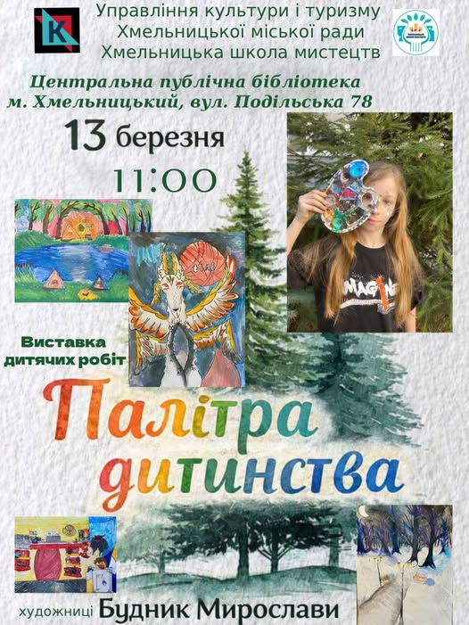 13 березня о 11 годині в центральній публічній бібліотеці Хмельницького відбудеться відкриття виставки «Палітра дитинства» учениці 4 класу Хмельницької школи мистецтв Будник Мирослави
