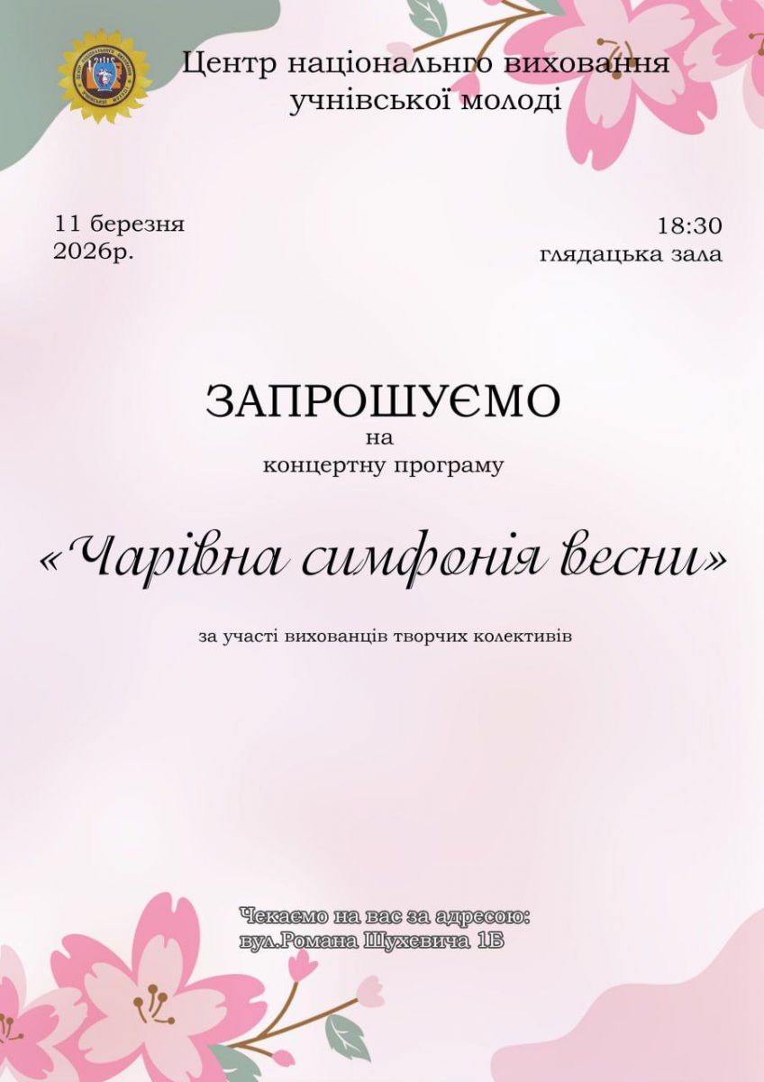 11 березня о 18:00 у глядацькій залі Центру національного виховання учнівської молоді відбудеться святкова концертна програма «Чарівна симфонія весни», присвячена Міжнародному жіночому дню.