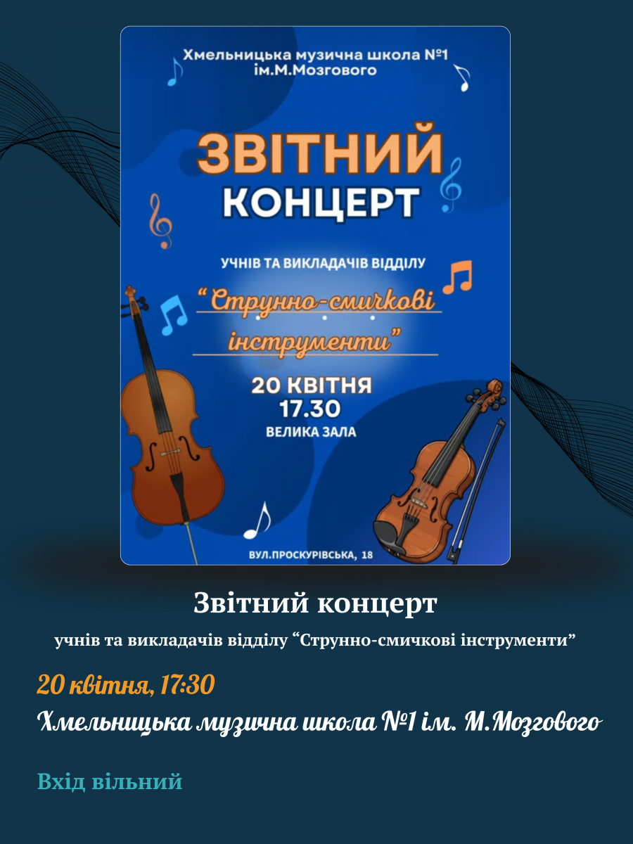 Запрошуємо відвідати звітні концерти учнів Хмельницької музичної школи №1 імені М.Мозгового 14, 15, 17,18, 20 та 21 квітня.