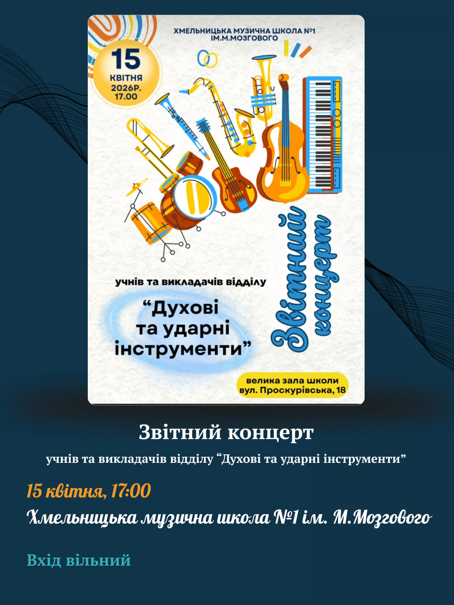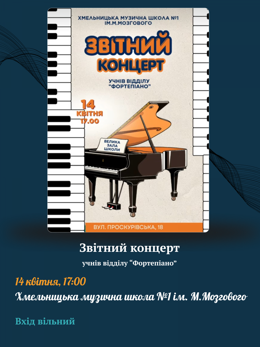 Запрошуємо відвідати звітні концерти учнів Хмельницької музичної школи №1 імені М.Мозгового 14, 15, 17 та 18 квітня.