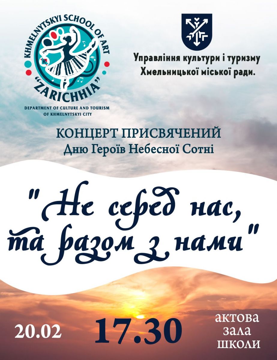 Запрошуємо разом з учнями та викладачами Хмельницької школи мистецтв «Заріччя» вшанувати пам'ять загиблих ГЕРОЇВ НЕБЕСНОЇ СОТНІ та відвідати концерт під назвою " Не серед нас та разом з нами", який відбудеться 20 лютого о 17.30 у актовій залі Хмельницької школи мистецтв «Заріччя».