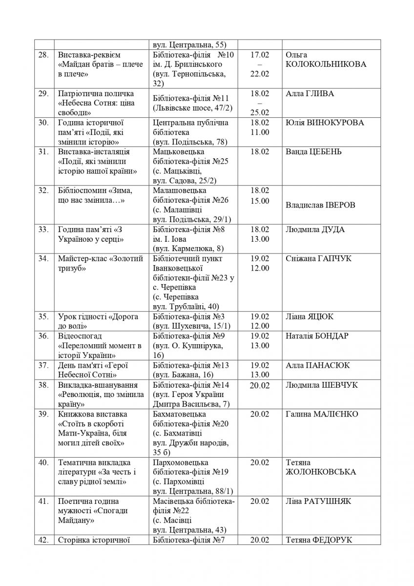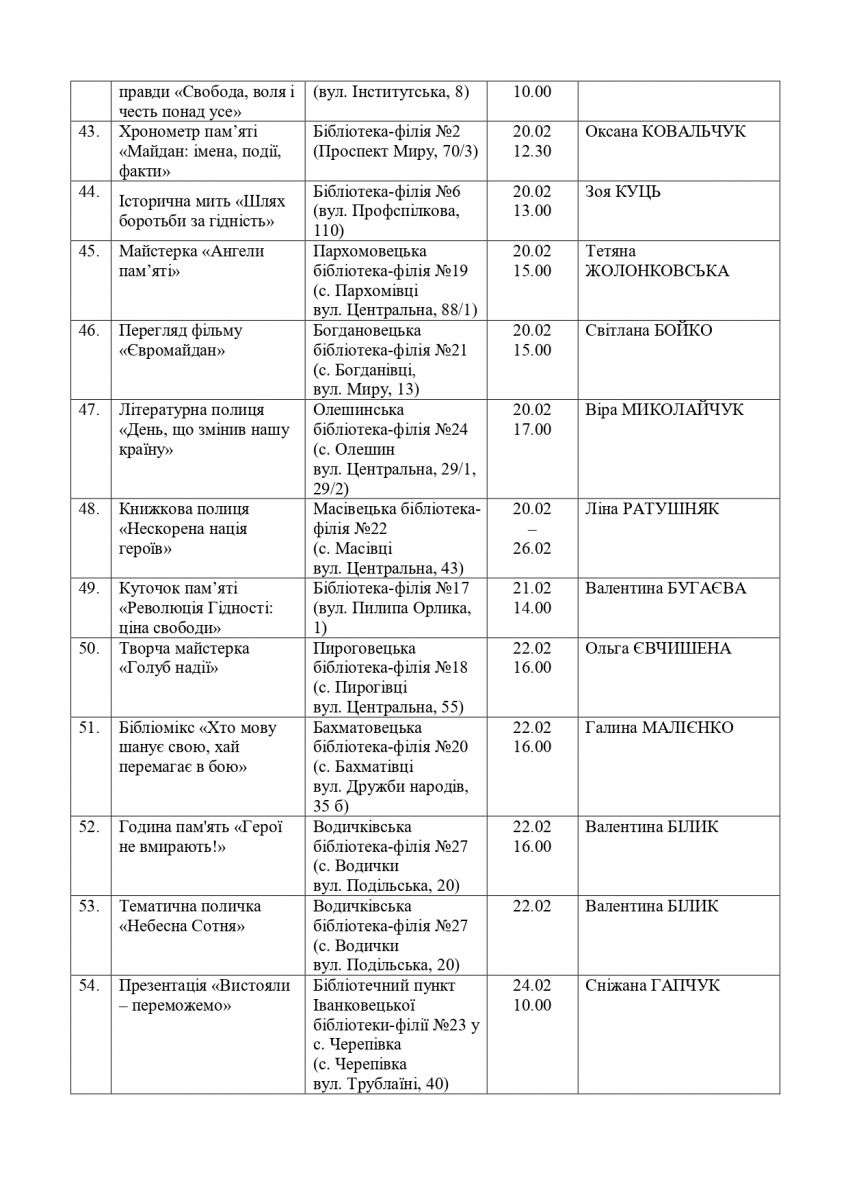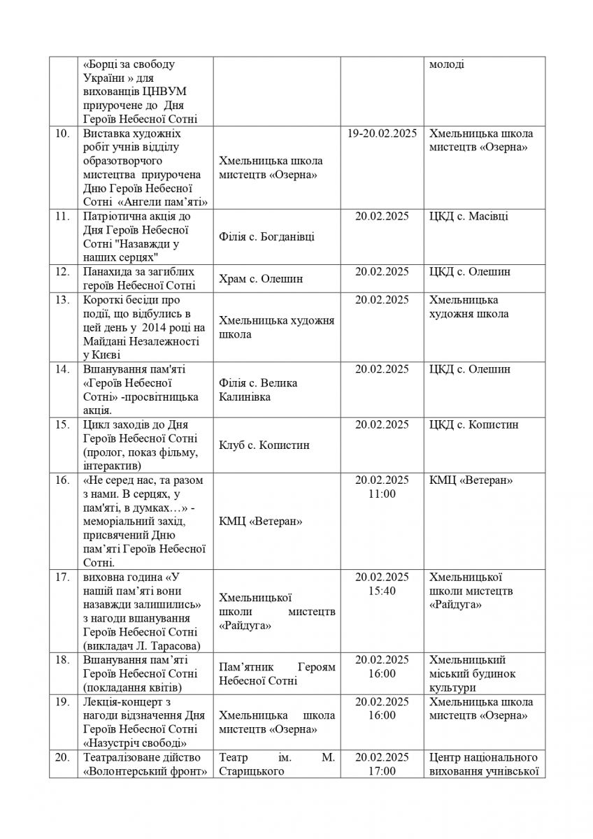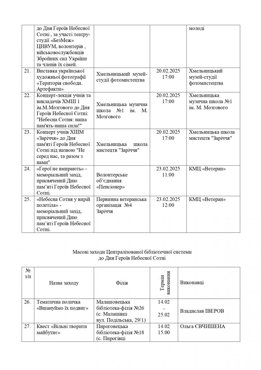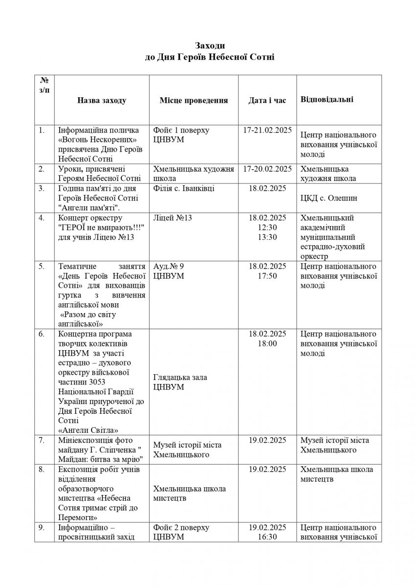 20 лютого на знак пам’яті про громадян, які загинули під час Революції Гідності щорічно відбувається вшанування Героїв Небесної Сотні. У дні скорботи та вдячності ми об’єднуємося, щоб згадати їхній подвиг і вклонитися їхній мужності. Запрошуємо долучитися та віддати шану тим, хто назавжди залишився у наших серцях. В закладах культури Хмельницької територіальної громади відбудуться меморіальні заходи, що перераховані нижче: