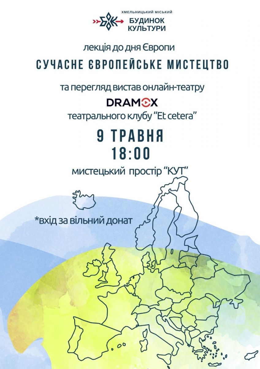 09 травня о 18.00 год., у приміщенні мистецького простору «Кут», театральний клуб «Et cetera» Хмельницького міського будинку культури, під керівництвом Дмитра ГУСАКОВА, запрошує поціновувачів театрального мистецтва на вечір, присвячений дню Європи в Україні «Сучасне європейське театральне мистецтво».