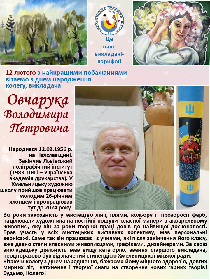 Також сьогодні, 12 лютого 2025 року день народження колишнього викладача Хмельницької художньої школи зі 42 - річним стажем Володимира Петровича Овчарука. З роси й води Вам, шановний колего, на довгі мирні і міцні роки! Будьте здорові і щасливі!