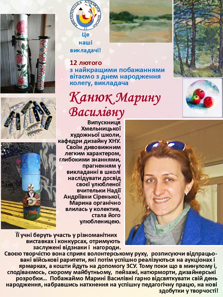 Сьогодні день народження Марини Василівни Канюк - молодої викладачки, яка має гарну школу - клас Сіренької Надії Андріївни і кафедру дизайну ХНУ. Цілеспрямована, освічена, розумна і постійно у пошуку нових знань і умінь, Марина відвідує всі можливі майстер-класи і сама їх вміло проводить. Вона веде активний спосіб життя, розмальовує тубуси, гільзи з-під снарядів і патронів, допомагаючи ЗСУ. Її учні беруть успішно участь у різноманітних конкурсах і виставках. Дай Боже, колего, щоб справдились всі Ваші сподівання, щоб Вам було любо і затишно жити у цьому світі при здоров`ї, мирі, спокої і щасті! З днем народження!