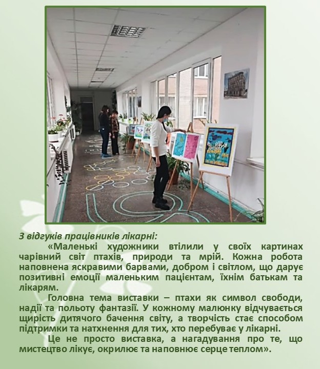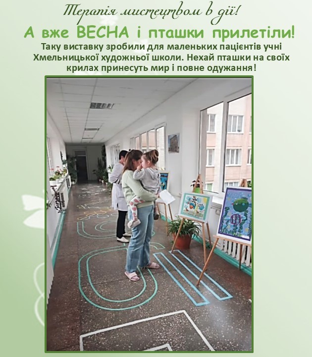 Вже не перший рік Хмельницька художня школа бере участь у цій акції «Терапія мистецтвом». З Хмельницькою міською дитячою лікарнею у школи давні міцні зв`язки, наші учні і викладачі допомагали розписувати і поліклініку, і рекреації, і палати. Велику роботу в цьому сенсі протягом кількох років проводить викладач Марія Барабаш. І навіть тепер, коли вона вже більш як півроку є в ній директором, її прагнення допомогти, підтримати, розрадити і створити красу і затишок залишаються не лише при ній, вона це продовжує робити, а й заохочує на добрі справи своїх колег і учнів. Зараз у Арт-просторі дитячої лікарні діє міні-виставка графічних творів учнів класів елементарного підрівня викладачок Марії Барабаш і Любові Хворостюк «пташки прилетіли». Ця невеличка виставочка сповнена тепла і старання юних художників, які ще тільки осягають сходинки до високого мистецтва. Проте їхні роботи несуть надзвичайно великий добрий заряд, що позитивно впливає на швидкий перебіг хвороби і сприяє одужанню маленьких пацієнтів.