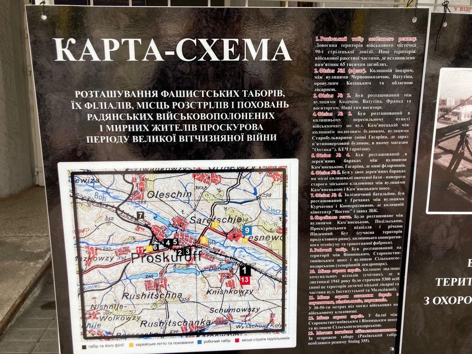 Широкому загалу на Проскурівській, 30 представлено інстальовані стенди зі сканами історичних документів, мапи, світлини, маловідомі історичні факти про злочинну нацистську діяльність у часи окупації на території Проскурова, охопленого цілою мережею філій Раківського концтабору суворого режиму для військовополонених рядового та сержантського складу Червоної армії.