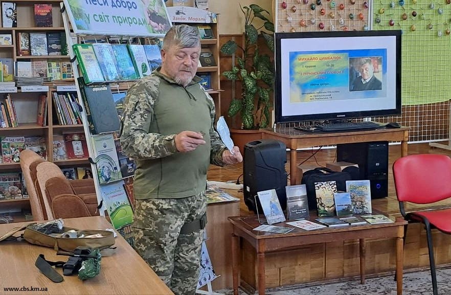 Михайло Цимбалюк — знаний подільський літератор, журналіст, а ще популяризатор державотворчих ідей та принципів. Він боронить нашу державу та як бойовий медик рятує українських бійців. 1 травня пан Михайло завітав на зустріч з дев’ятикласниками гімназії №20. Подія мала назву «З українським словом у серці!» та відбулася в читальній залі Центральної публічної бібліотеки м. Хмельницького.