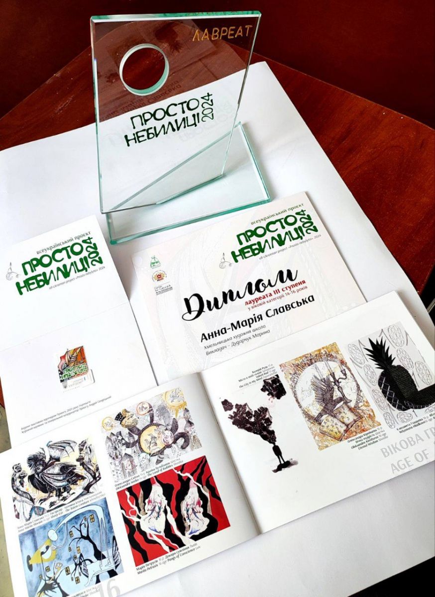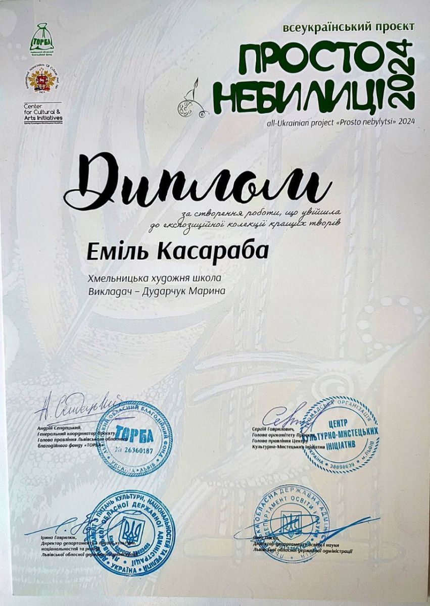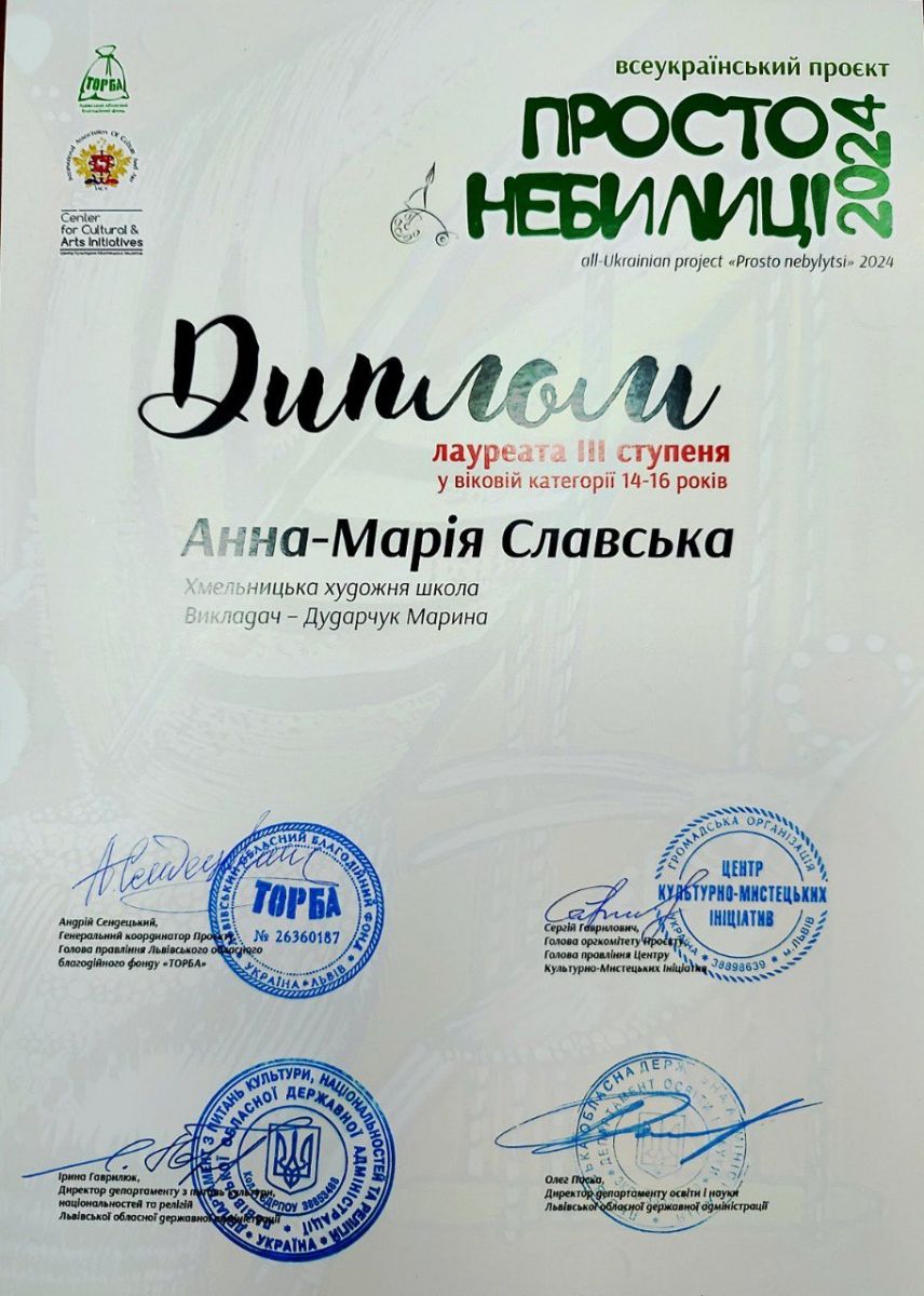 Із 717 творів, що розглядались членами журі, було відібрано 130 для експозиційної колекції. Прикметно, що Хмельницька художня школа вже не перший рік бере участь у цьому оригінальному конкурсі, де діти можуть мовою образотворчості висловити всі свої фантазії, мрії, незаангажований політ творчої думки, а також продемонструвати рівень художньої майстерності відповідно до свого віку. І в проєкті «Просто небилиці» 2024 учніХмельницької художньої школипотрапили в це щасливе число 130, отже про наших юних мистців будуть знати не лише в нашому місті, в Україні, а й за її межами. Звання лауреата ІІІ ступеня і почесну марку, що вже дев`ятий рік поспіль випускає Укрпошта , а також пам`ятний знак лауреата отримала Анна-Марія Славська (викладач Марина Дударчук), і ще три учні удостоєні дипломів учасників експозиційної колекції кращих творів. Це учениця Валентини Цноти – Анастасія Кондрацька, учень Лариси Слюсаренко Артем Базилик та учень Марини Дударчук Еміль Косараба, які крім того отримали дарунки у вигляді художнього приладдя. З усіх 130 художніх праць була утворена експозиційна колекція Всеукраїнського проєкту «ПРОСТО НЕБИЛИЦІ» 2024, з якою можна ознайомитись в Україні і за кордоном. Проте, як зазначають організатори проєкту: «Через загрози, пов’язані з російською злочинною агресією на території України, презентація результатів та виставка відбудуться в онлайн-форматі. Ознайомитися з експозицією можна буде у віртуальній галереї Центру Культурно-Мистецьких Ініціатив та Львівського обласного благодійного фонду «ТОРБА», а також у фізичних виставкових просторах галерей-партнерів у рамках їхнього графіку роботи, враховуючи стан небезпеки в Україні. За межами України презентації відбуваються згідно з графіком виставкової активності галерей-партнерів». Програма й актуальна інформація стосовно Проекту — на офіційних сайтах координатора Проекту lvivtorba.com та організатора Проекту artcenter.org.ua
