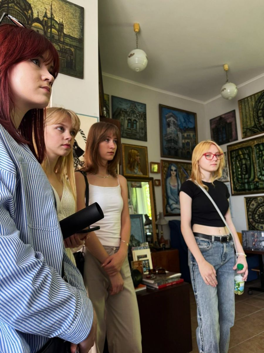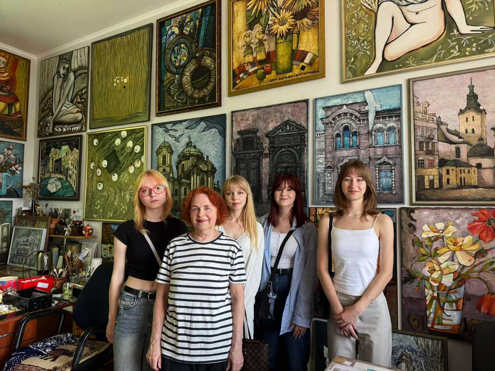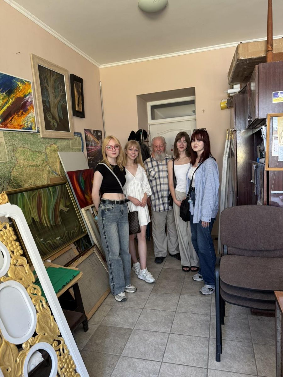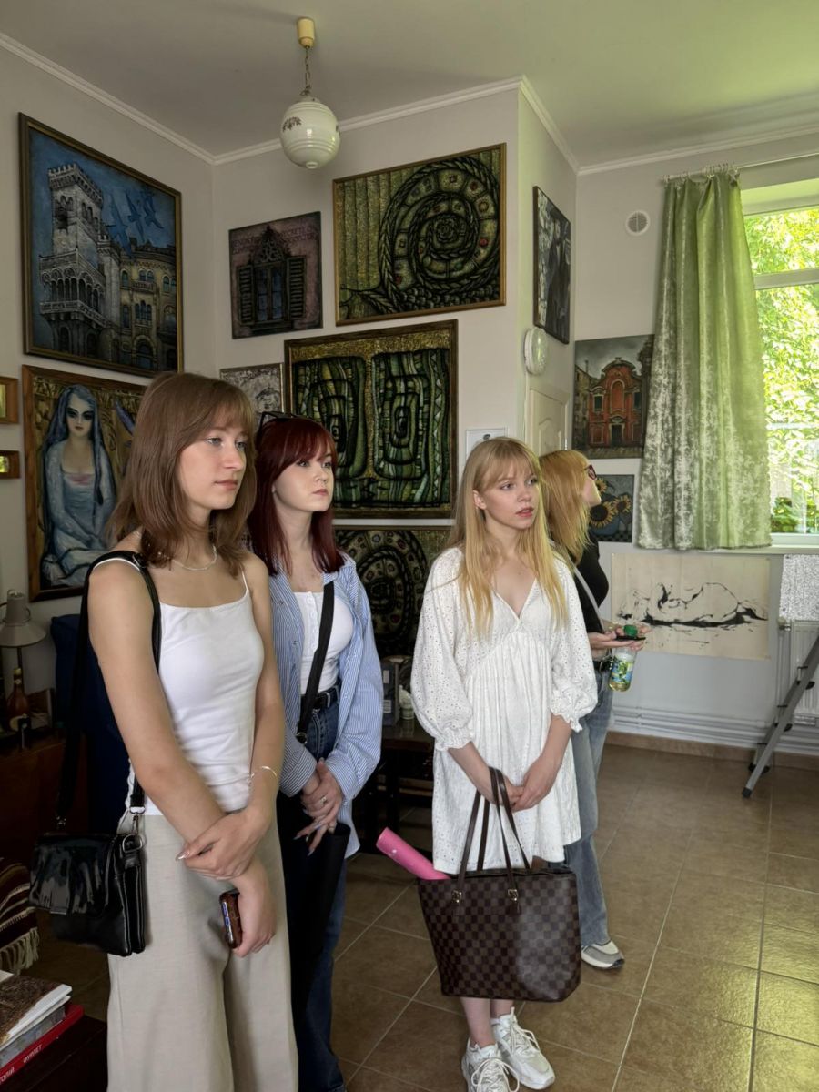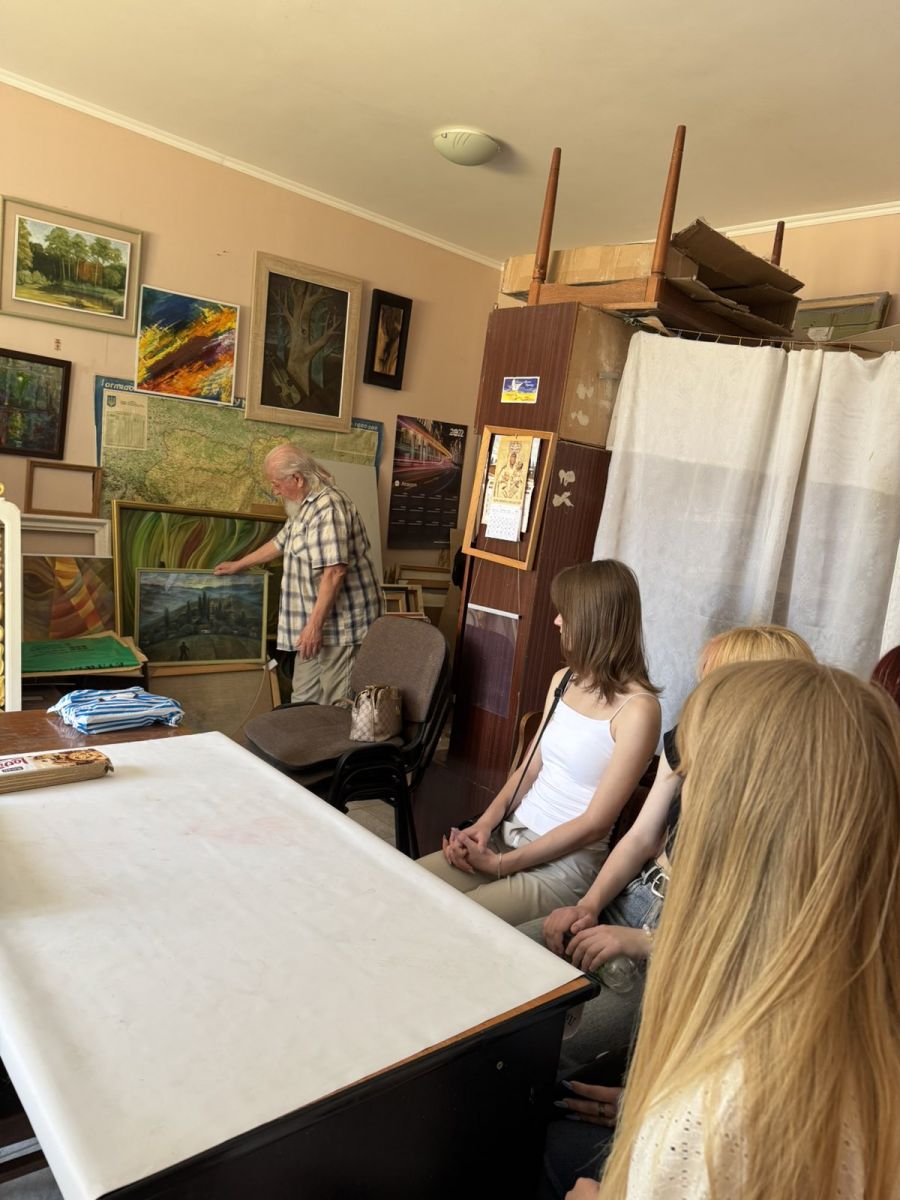 Крім того була можливість поспілкуватись з нею, юні художниці дізнались деякі секрети графічних аркушів, які завжди бувають «родзинками» на будь-яких вернісажах, почули про особливості колориту її картин. Бесіда була невимушеною, корисною, учні дізнались для себе багато корисного. Вони ще зовсім юні, але талановиті, націлені на продовження опанування професії художника. І хто знає – може зовсім скоро в цій будівлі на дверях майстерень будуть написані і їхні прізвища – імена нових членів художньої спільноти України! Нехай їм щастить!