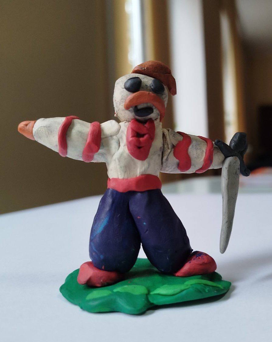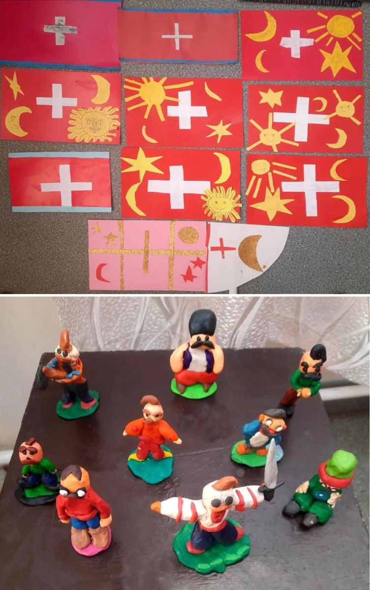 До Дня українського козацтва учні перших класів Ірини Бочулі старанно і досить вміло також ліпили з кольорового пластиліну фігурки козаків. Вони вийшли яскраво привабливими, часом трохи кумедними, але по цих маленьких скульптурках можна одразу здогадатись, що перед зображення людей не теперішнього часу, а сивої давнини: і аксесуари, і атрибути, і одяг, і зачіски в них зовсім не подібні до сучасних. І виконання цих творів також увійшло до списку заходів, які Ірина Сергіївна зробила до Національного свята України – Дня українського козацтва. Пам’ятаймо наше коріння, наших пращурів, які виборювали і берегли нашу Україну! Слава українським козакам! Слава Україні та сучасним воїнам ЗСУ!