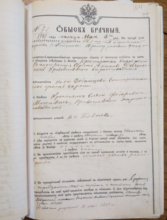 Нещодавно нам вдалося відшукати ще один цікавий документ у фондах Державного архіву Хмельницької області, котрий суттєво доповнює таємницю вибору професії і першого місця праці Костя Місевича. У «Шлюбному обшуку №7 Свято-Покровської церкви села Глезнова Проскурівського повіту» від 6 травня 1907 року йдеться про узгоджений шлюб у цій церкві між рідною сестрою Костя Місевича, двадцятичотирьохрічною селянкою Оленою Федорівною Місевич (на сім років старша від Костя Місевича – авт.) та двадцятип`ятилітнім селянином колезьким реєстратором Сергієм Якимовичем Рачинським, мешканцем станції Дебальцеве Катеринославської залізниці. В документі зазначено, що поручителем від нареченого виступив помічник начальника станції Проскурів Дмитро Федорович Місевич, себто старший рідний брат Костя і Олени Місевичів. До речі, за даними хмельницького краєзнавця Миколи Новицького, котрі ще потребують подальшого вивчення (публікації в тодішній центральній пресі закордонних бібліотек, до яких нині доступ обмежений), в червні 1914 року начальник станції Проскурів(!) Дмитро Федорович Місевич був указом російського імператора удостоєний звання «почесний громадянин».