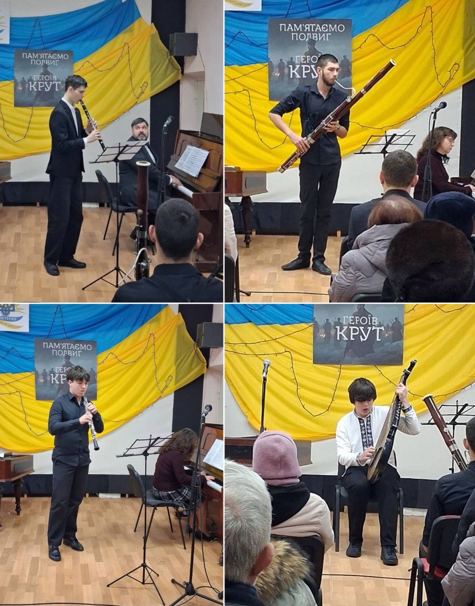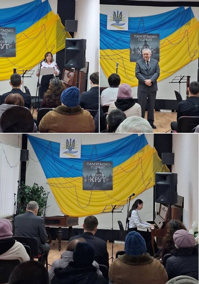 29 січня 2026 року, в залі КМЦ «Ветеран» відбувся меморіальний захід вшанування пам'яті Героїв Крут за участю студентів Хмельницького музичного фахового коледжу ім. В. Заремби і ветеранів міста. Цього дня 108 років тому, 29 січня 1918 року, поблизу залізничної станції Крути, що на Чернігівщині, українські добровольці, курсанти, студенти та гімназисти - вступили в бій із переважаючими більшовицькими військами. . Їхній подвиг став одним із визначальних моментів у боротьбі за державність України. У цей день прийнято віддавати данину стійкості і мужності молодих хлопців, які так само, як і сьогоднішні воїни ЗСУ, стали на захист української держави від зовнішнього агресора. В цей трагічний день виступи юних обдарованих музикантів, які виконували твори українських композиторів звучали по- особливому натхненно і вкотре засвідчили унікальність української культури та незламність нашого народу .
