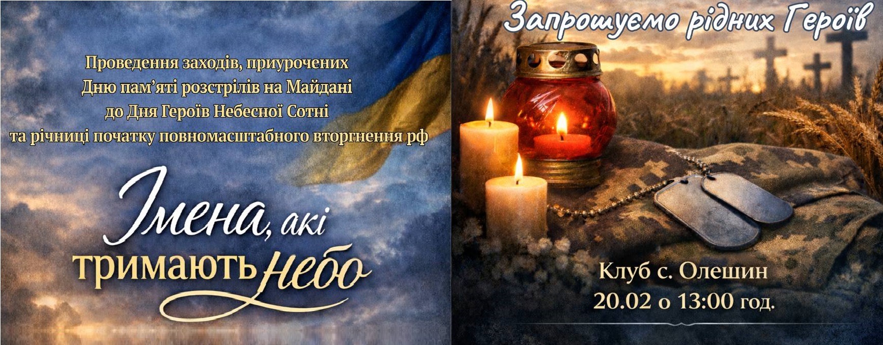 ДетальнішеЗапрошуємо рідних Героів НА ВЕЧІР ПАМ?ЯТІ ЗАГИБЛИХ ЗАХИСНИКІВ ОЛЕШИНСЬКОГО СТАРОСТАТУ "Імена, які тримають небо". Клуб с. Олешин 20.02 о 13:00 год.