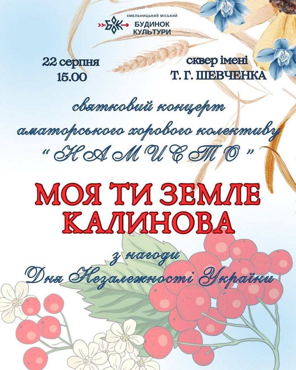 22 серпня о 15.00 у сквері імені Т. Г. Шевченка, відбудеться святковий концерт аматорського хорового колективу «НАМИСТО», з нагоди Дня Незалежності України!