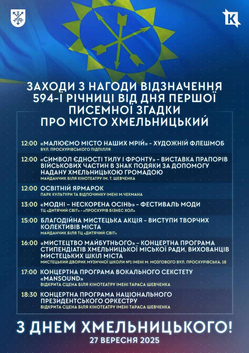 Хмельницькому – 594! Цими днями наше рідне місто відзначає 594-ту річницю з часу першої писемної згадки. З цієї нагоди у Хмельницькому відбуваються різноманітні заходи: мистецькі виступи і виставки, концерти, тематичні зустрічі та екскурсії. Це чудова нагода відчути неповторний дух міста, згадати його історію та разом творити нові сторінки сучасності.
