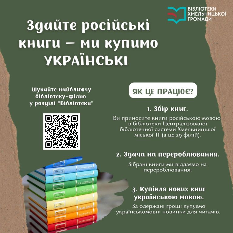 Як це працює? Ви приносите книги російською в бібліотеки Централізованої бібліотечної системи Хмельницької міської ТГ (а це 29 філій, що розташовані у Хмельницькому та селах громади). Це може бути художня, пропагандистська, радянська література і т.д. — вся, написана мовою ворога. Зібрані книги бібліотеки віддають на перероблювання. А за одержані гроші для читачів закуповують українськомовні новинки — літературу, якої не вистачає на полицях і про яку регулярно запитують відвідувачі.
