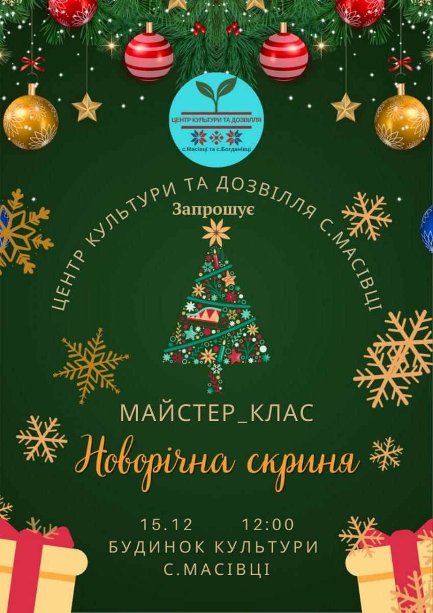 Любительське об'єднання "Майстерня креативної творчості" ЦКД с. Масівці запрошує усіх бажаючих долучитися до виготовлення різдвяних прикрас та новорічних подарунків на майстер класі "Новорічна скриня".