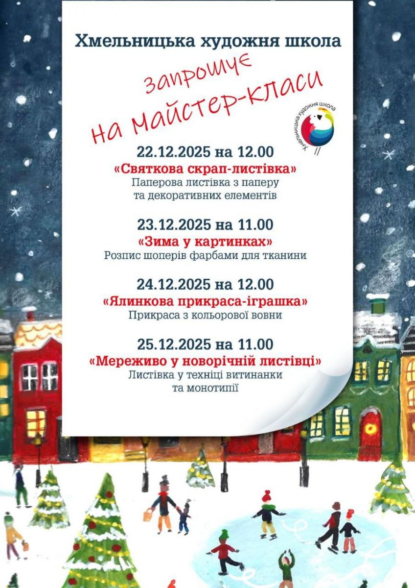 Хмельницька художня школа запрошує на серію святкових майстер-класів, присвячених створенню авторських листівок, новорічних прикрас та зимових художніх виробів. Учасники зможуть власноруч виготовити унікальні роботи з паперу, вовни та тканини та поринути в атмосферу творчості напередодні Різдвяних свят.