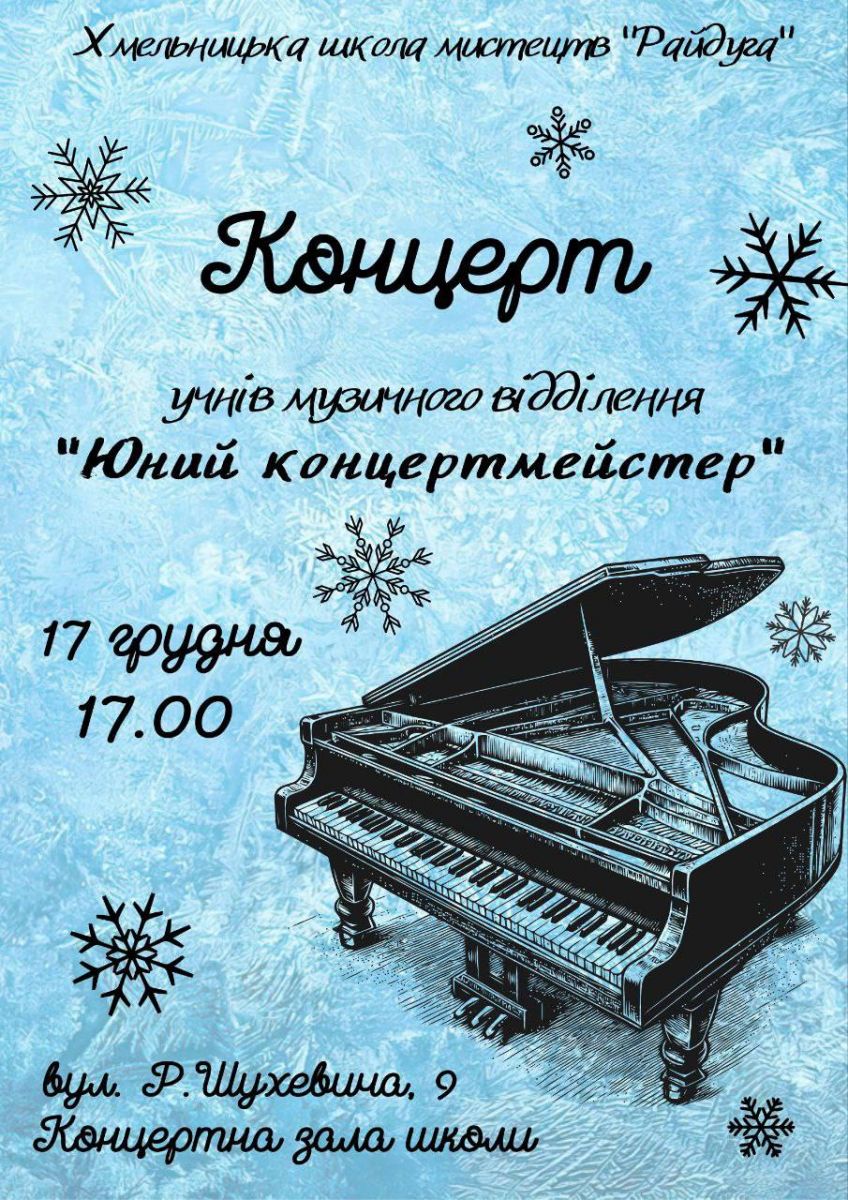 17 грудня о 17:00 у концертній залі Хмельницької школи мистецтв «Райдуга» відбудеться концерт учнів музичного відділення «Юний концертмейстер».