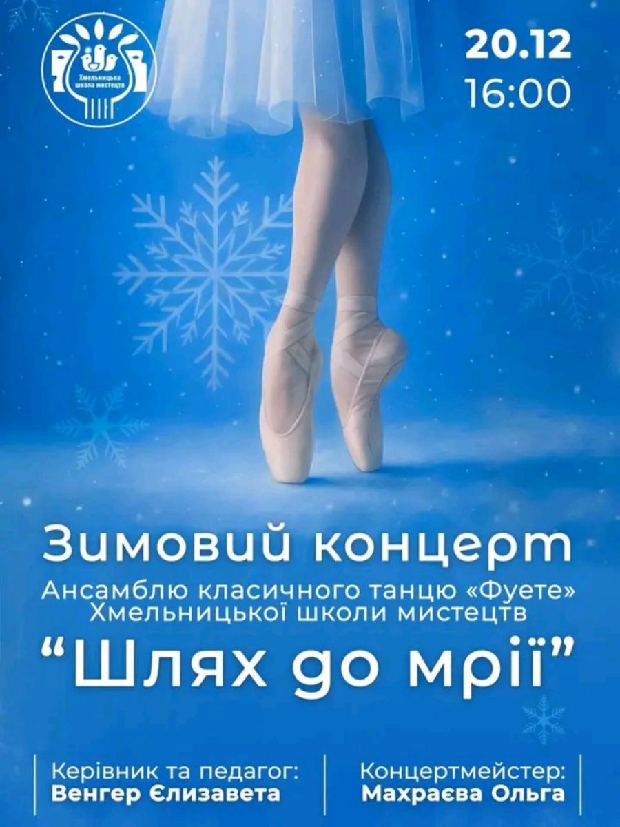 20 грудня (субота) 2025 року о 16:00 в концертній залі Хмельницької школи мистецтв відбудеться зимовий концерт ансамблю класичного танцю «Фуете», викладач Єлизавета Венгер. В програмі учні школи виконають уривки з балетів української та світової класики та авторські постановки викладача.