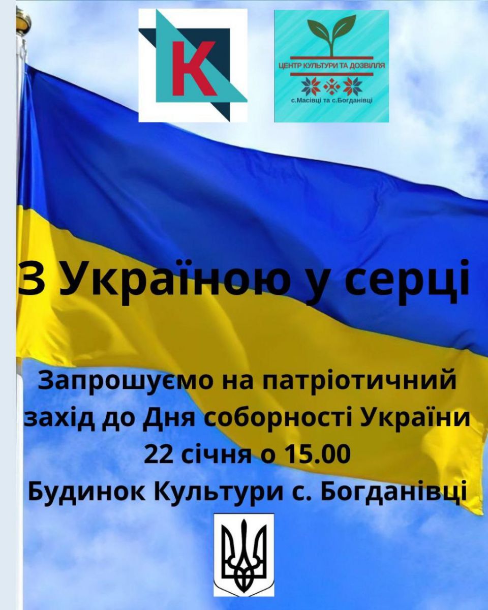 ЦЕНТР КУЛЬТУРИ ТА ДОЗВІЛЛЯ с.Масівці та с.Богданівці запрошує на патріотичний захід до Дня соборності України "З Україною у серці", що відбудеться 22 січня о 15:00 у Будинку Культури с. Богданівці