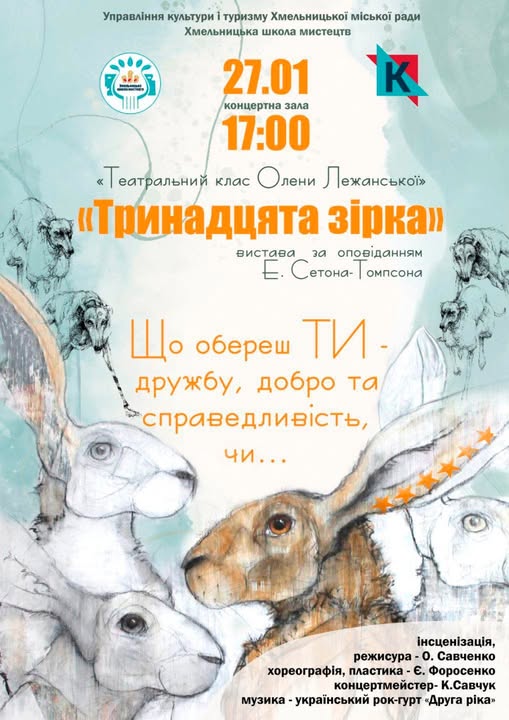 «Тринадцята зірка» 27 січня о 17 годині в Хмельницькій школі мистецтв відбудеться вистава за оповіданням Є. Сетона -Томпсона «Тринадцята зірка». Вистава без вікових обмежень. Вона вчить добру, справедливості та любові - що важливо для дітей; розкриває глибокі сенси стосунків дружби, мудрості та кохання - що цікаво для дорослих. Динамічна, інтригуюча, захоплююча «Тринадцята зірка» від «Театрального класу Олени Лежанської»! Пориньте з акторами у світ, де поряд із боротьбою за своє життя розгортаються сутички між героями, де зрада допомагає знайти справжнє кохання, де кожний обирає сам свій шлях… А що обереш - ТИ?