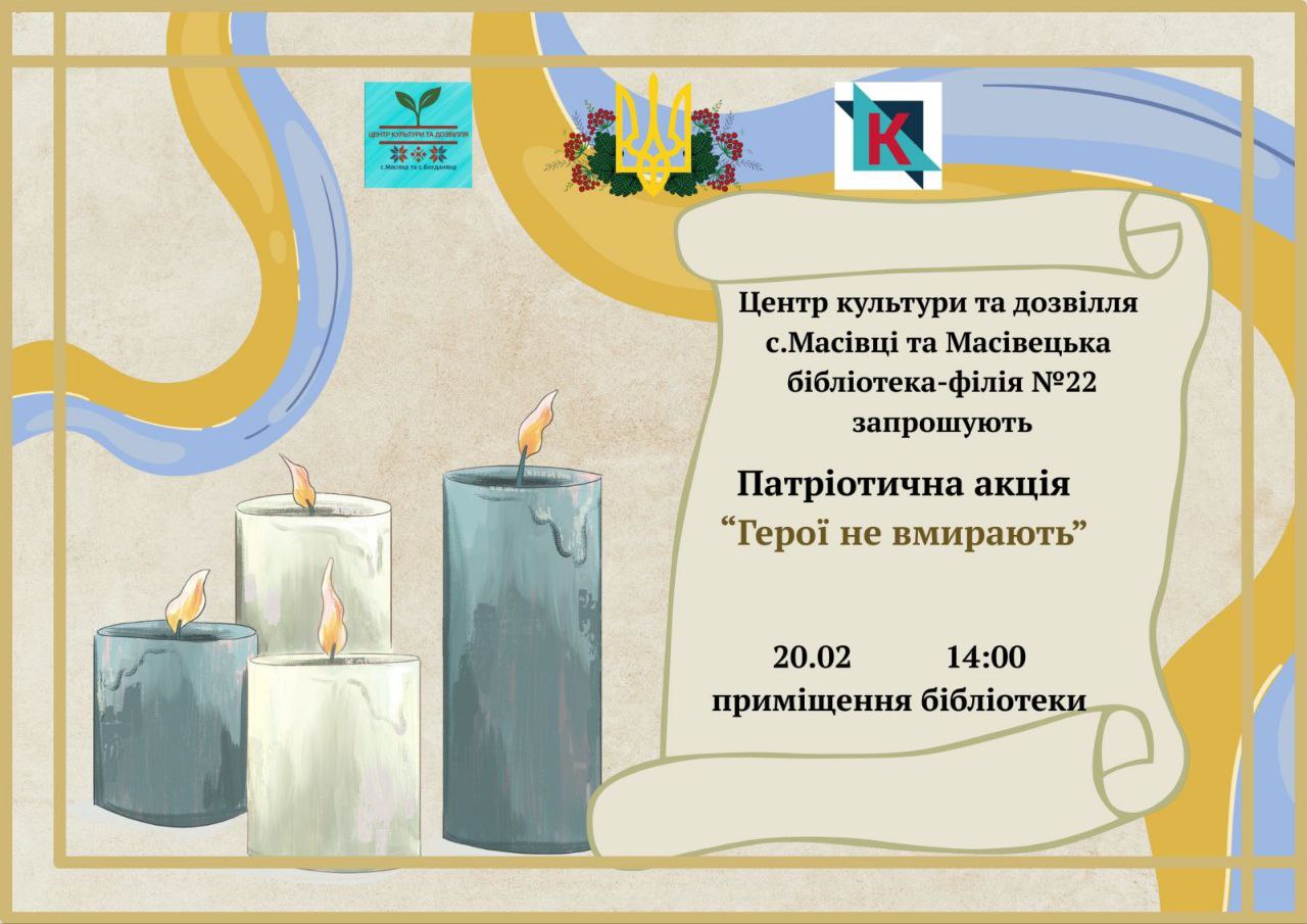 Центр культури та дозвілля с. Масівці та Масівецька бібліотека-філія № 22 запрошують 20.02 о 14:00 у приміщення бібліотеки, де відбудеться Патріотична акція "Герої не вмирають".