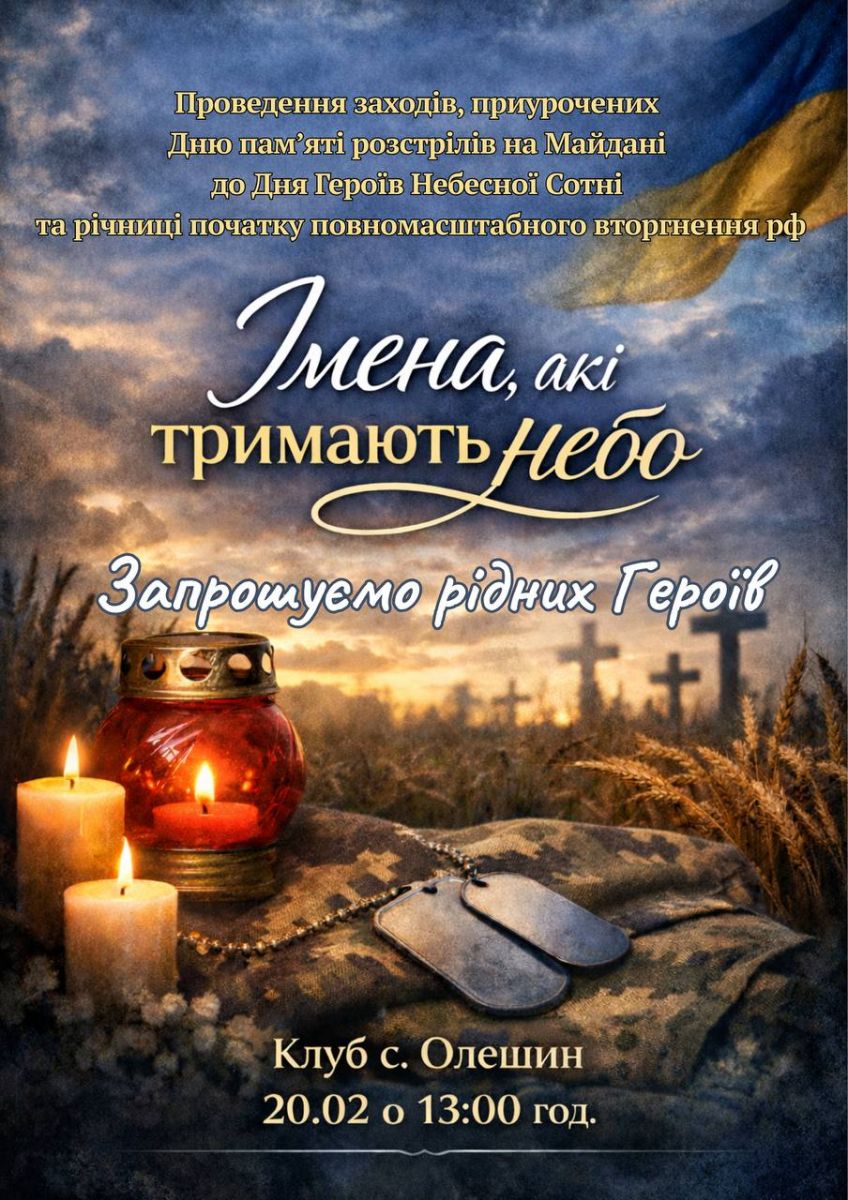 Запрошуємо рідних Героів НА ВЕЧІР ПАМ?ЯТІ ЗАГИБЛИХ ЗАХИСНИКІВ ОЛЕШИНСЬКОГО СТАРОСТАТУ "Імена, які тримають небо". Клуб с. Олешин 20.02 о 13:00 год.