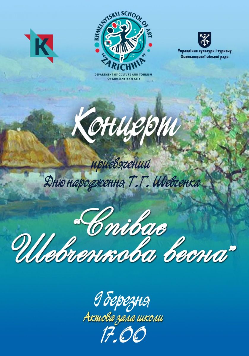 9 березня о 17.00 у Хмельницькій школі мистецтв "Заріччя" відбудеться концерт під назвою " Співає Шевченківська весна" .