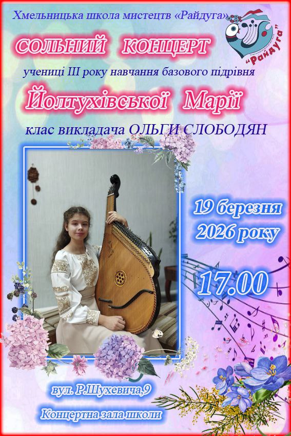 У Хмельницькій школі мистецтв «Райдуга» 19 березня 2026 року о 17:00 відбудеться сольний концерт учениці ІІІ року навчання базового підрівня Йолтухівської Марії (клас викладача Ольги Слободян).