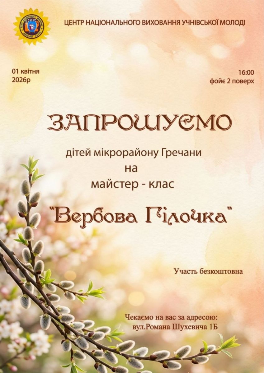 1 квітня о 16:00 у Центрі національного виховання учнівської молоді відбудеться відкритий майстер-клас з виготовлення вербової гілочки для дітей мікрорайону Гречани. Учасники зможуть власноруч створити символічний виріб, познайомитися з традиціями та провести час у творчій, дружній атмосфері.