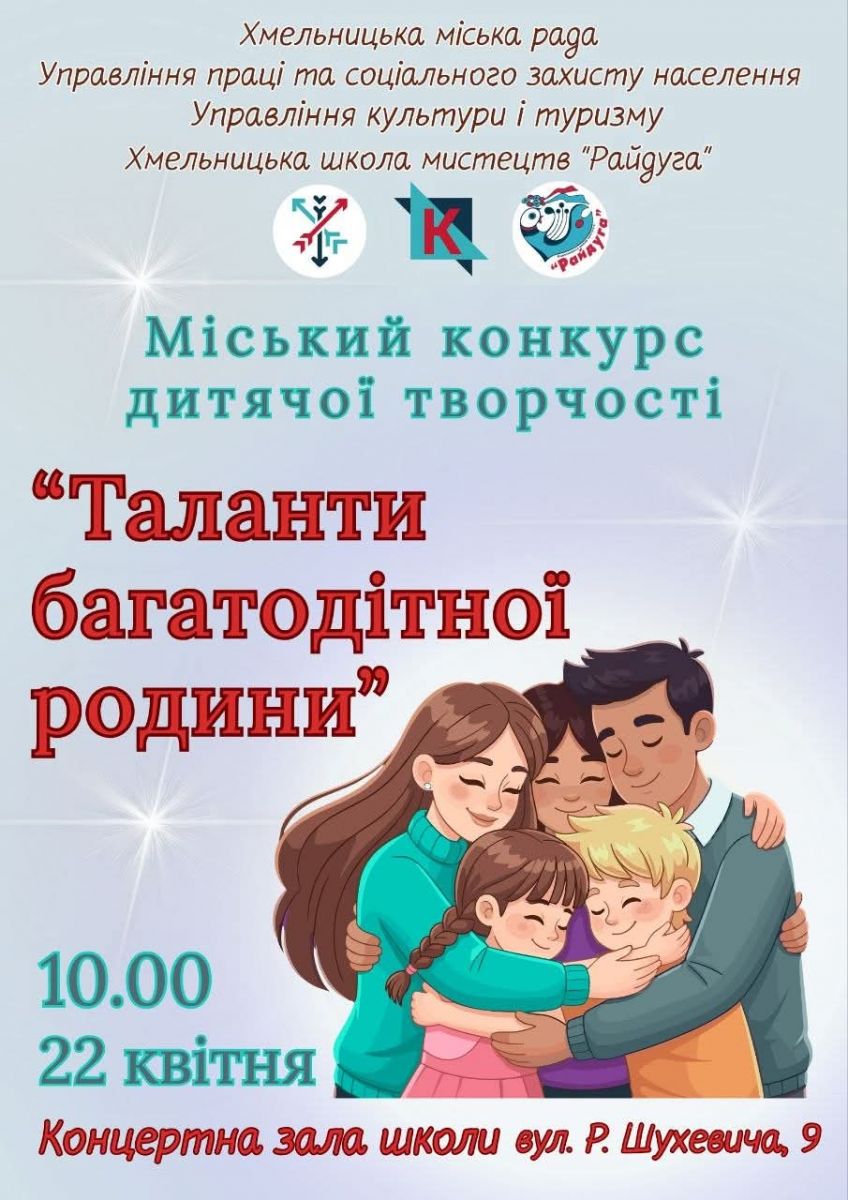 22 квітня 2026 р. у концертній залі Хмельницької школи мистецтв «Райдуга» (вул. Романа Шухевича, 9) відбудеться міський конкурс дитячої творчості "Таланти багатодітної родини". Початок о 10.00.