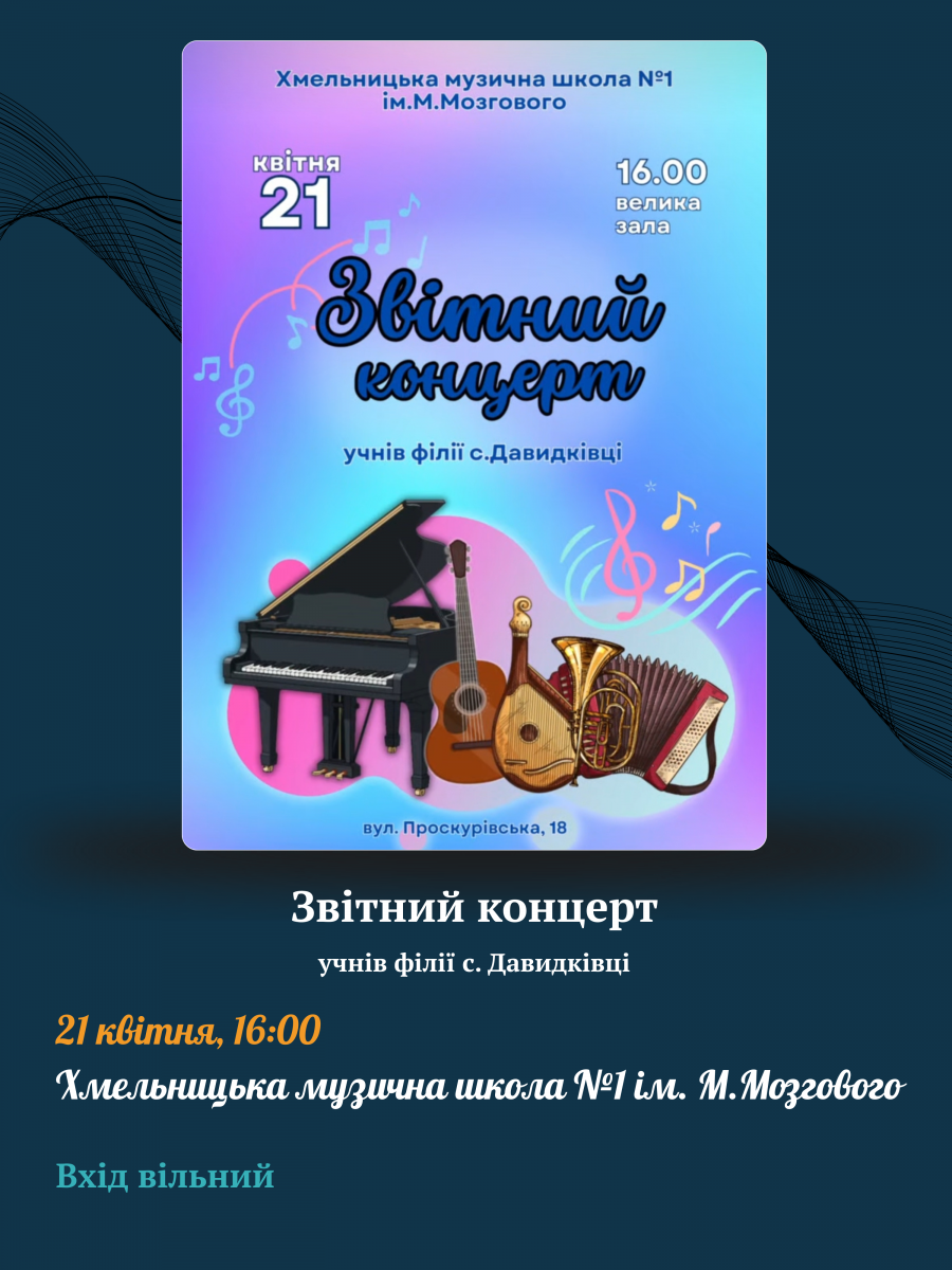 Запрошуємо відвідати звітні концерти учнів Хмельницької музичної школи №1 імені М.Мозгового 14, 15, 17,18, 20 та 21 квітня.